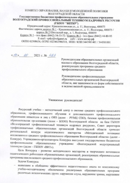 sБазовая профессиональная образовательная организация и РУМЦ СПО Волгоградской области ГБПОУ «Волгоградский профессиональный техникум кадровых ресурсов» (далее ГБПОУ «ВПТКР») совместно с Советом директоров профессиональных образовательных организаций Волгоградской области на базе ГБПОУ «Волгоградский индустриальный техникум» с 03.04.2024 г. – 16.05.2024 года проводят региональный конкурс педагогического мастерства «Методический потенциал инклюзивного среднего профессионального образования Волгоградской области и Республики Калмыкия».