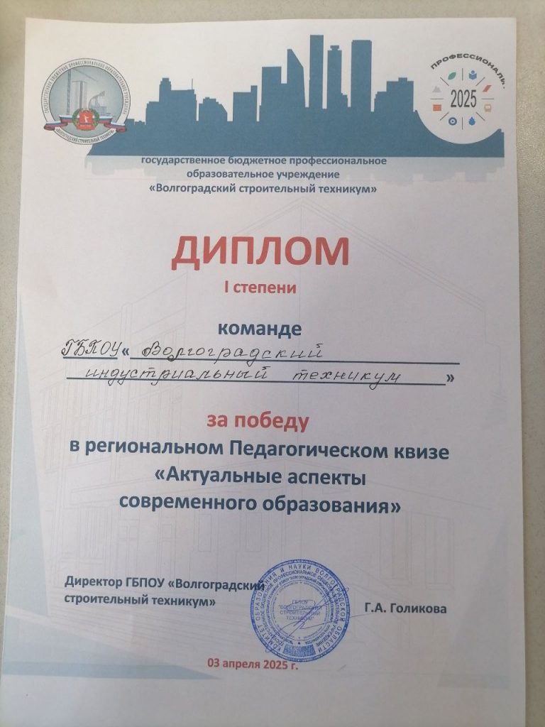 3 апреля 2025 г. команда педагогов Волгоградского индустриального техникума – Кутыга Г.А., Рудкова С.В. и Смирнова А.В. – одержала победу в региональном Педагогическом квизе “Актуальные вопросы современного образования”, который проходил в Волгоградском стоительном техникуме. Поздравляем победителей!