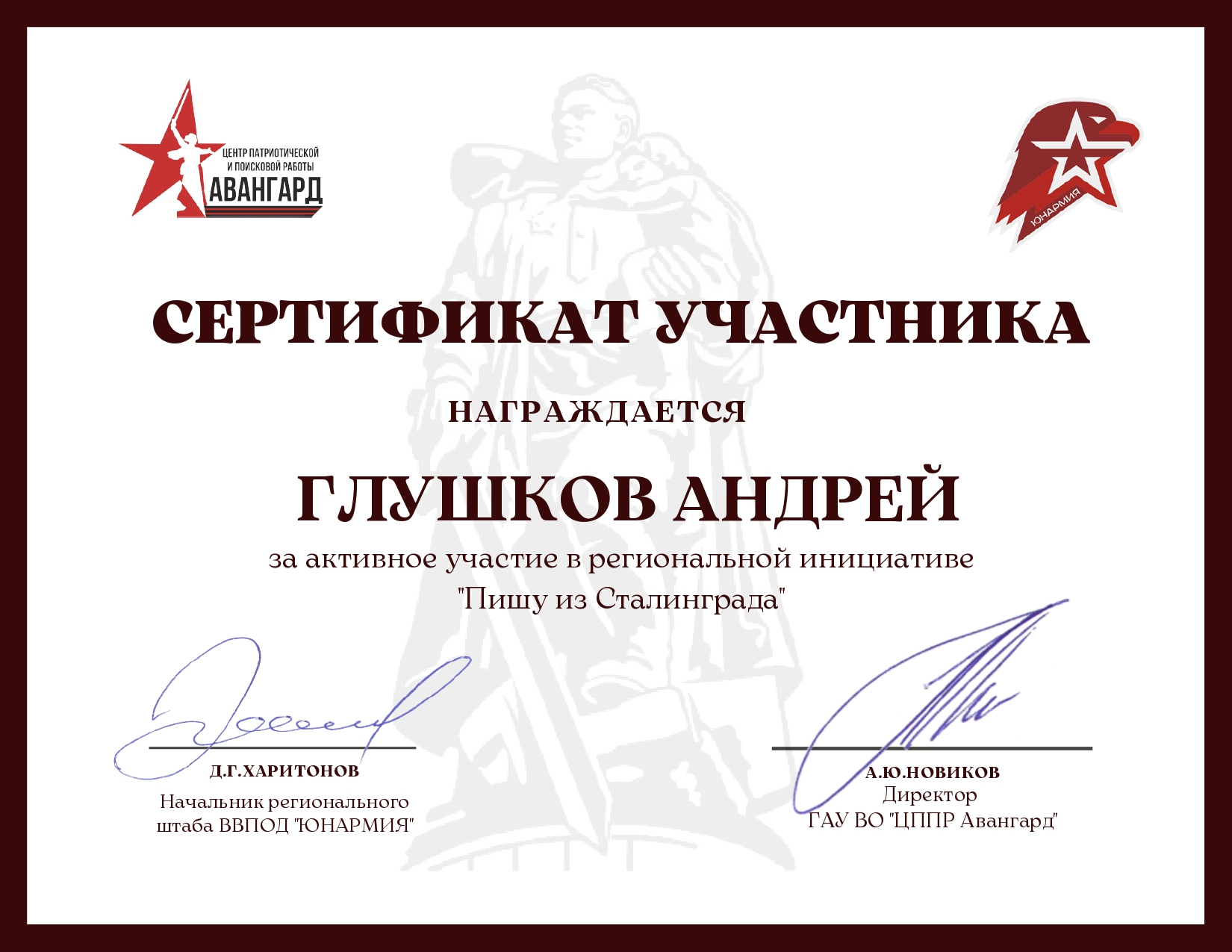В Связи с этим событием Государственное автономное учреждение Волгоградской области «Центр патриотического и поисковой работы «Авангард» при поддержке регионального отделения Всероссийского детско-юношеского военно-патриотического общественного движения «ЮНОРМИЯ» запустила инициативу «Пишу из Сталинграда». Цель – сохранение исторической памяти, популяризация героических подвигов и историй фронтовиков, а также расширение знаний у молодого поколения о событиях Сталинградской биты.