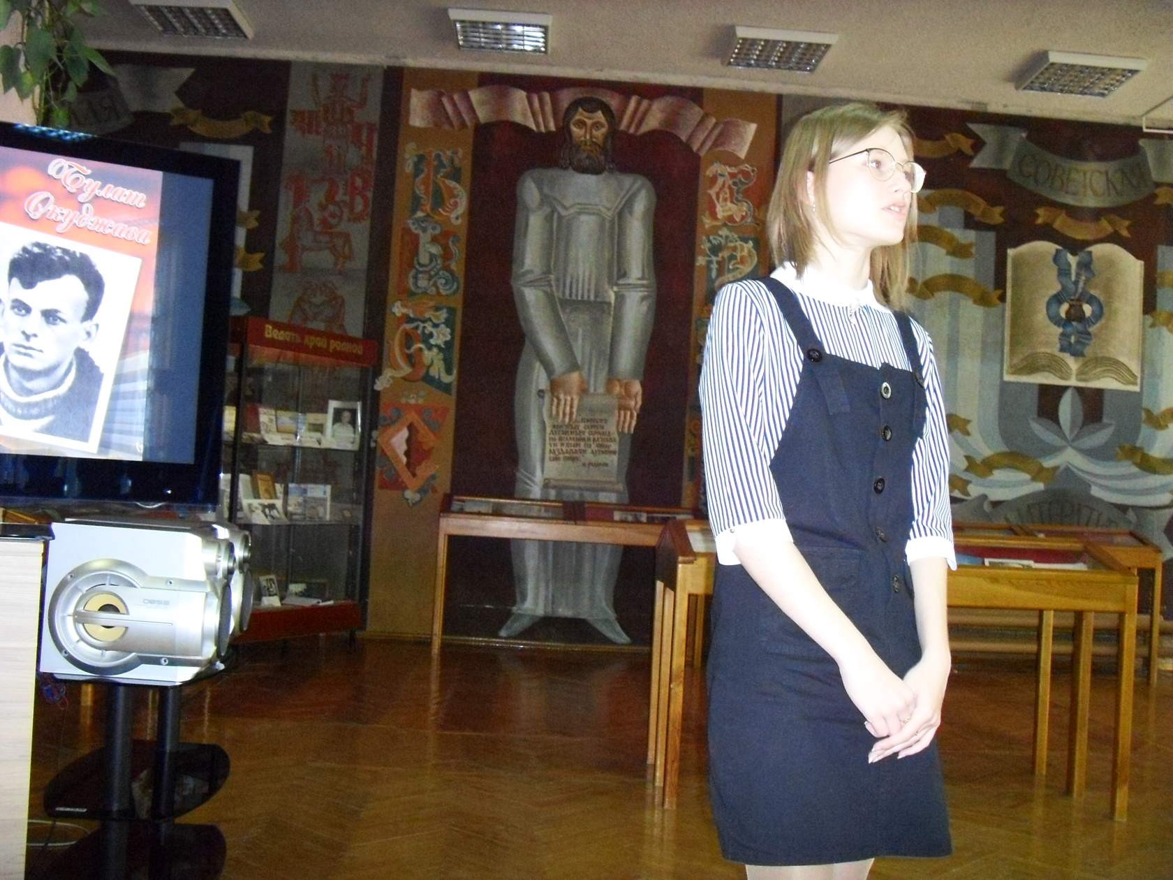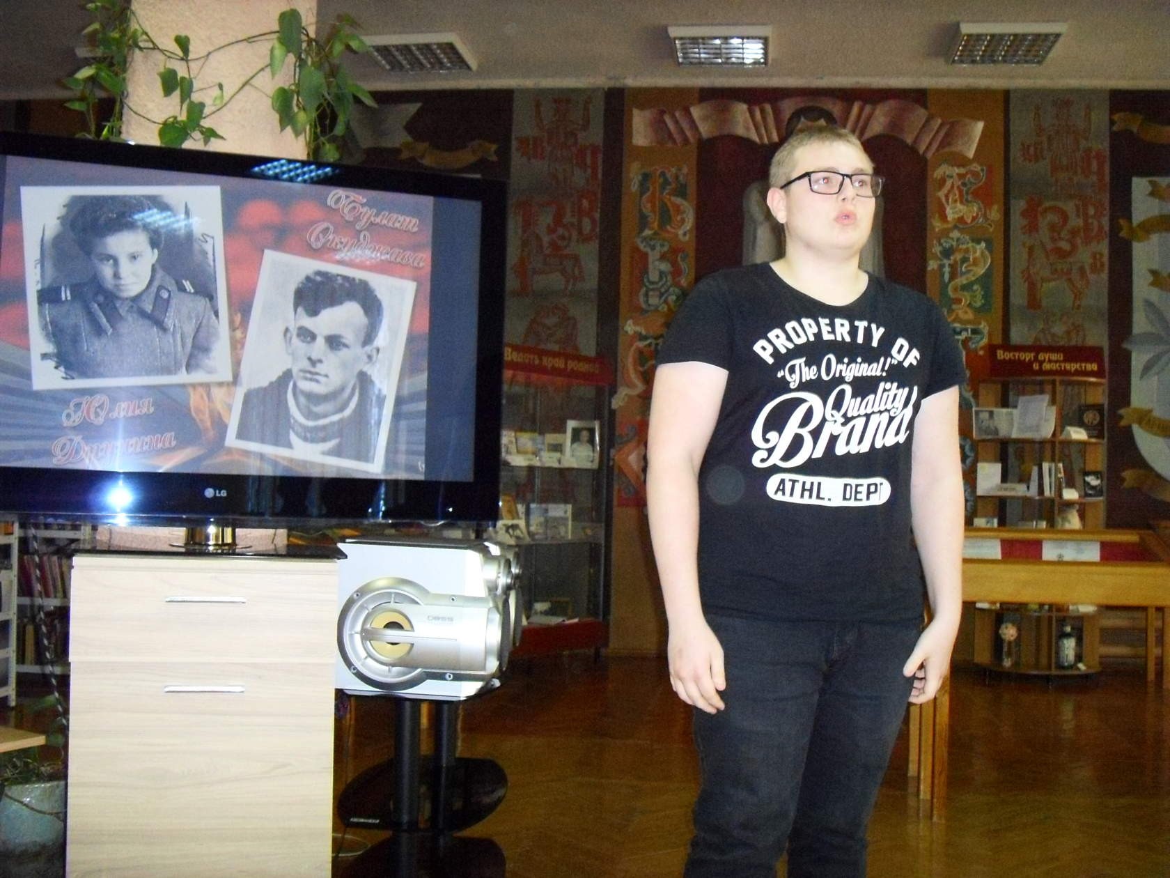 Эти слова о тех, кто также, как и он, ушёл со студенческой скамьи на фронт. Юрий Бондарев, Виктор Астафьев, Василь Быков, Борис Васильев, Николай Старшинов, Михаил Луконин, Павел Коган, Михаил Кульчицкий, Николай Майоров, Всеволод Багрицкий, Эдуард Асадов – это их юность опалила война. Среди них – Булат Окуджава и Юлия Друнина. Именно о них в год их 95- летнего юбилея, об их военной судьбе и военной поэзии шла речь в литературно-музыкальной композиции «А была моя юность военной…». Сценарий был подготовлен Барбозой Анной Вениаминовной, сотрудником библиотеки № 18. В нём были представлены видеофрагменты из фильмов, в которых звучали песни Булата Окуджавы – «Десятый наш десантный батальон», «Бери шинель», «До свидания, мальчики», показаны отрывки из знаковых фильмов о Великой Отечественной войне – «Летят журавли», «А зори здесь тихие».