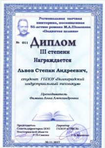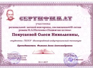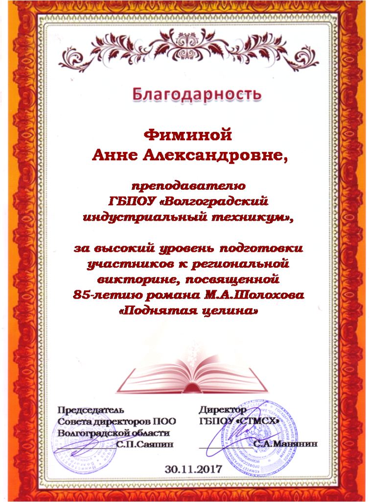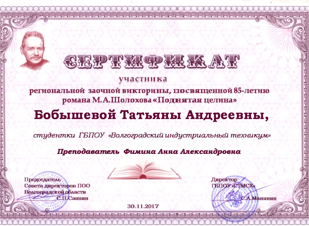 В целях содействия творческому выражению и личностному развитию обучающихся, популяризации и пропаганды отечественной литературы Серафимовичским техникумом механизации сельского хозяйства с 1 ноября по 20 ноября 2017 года была организована и проведена викторина по книге М.А. Шолохова, русского писателя, лауреата Нобелевской премии. В викторине, которая предусматривала ответы на 50 вопросов по содержанию романа М.А.Шолохова «Поднятая целина», приняли участие Бобышева Татьяна, гр. П.-1-17(сертификат участника), Львов Степан, гр.П.-1-17 (диплом 3 степени), Покусаева Олеся, гр.ТМ-1-17(сертификат участника) – преподаватель Фимина А.А.