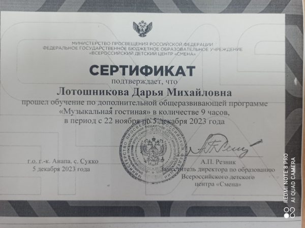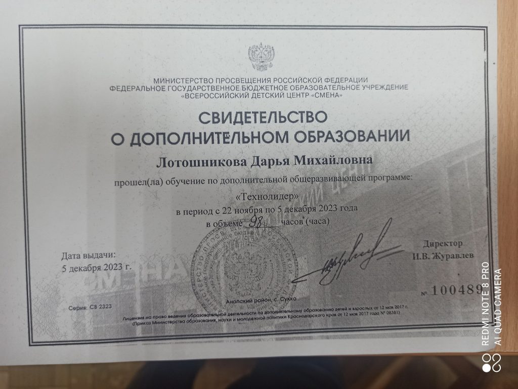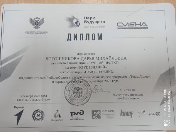 В конце уходящего 2023 года я получила приглашение в лагерь «Профи» по программе «Техно-Лидер» во Всероссийский Детский Центр «Смена», город Анапа. Предварительно я отправила свои грамоты, дипломы, характеристику, сертификаты за участие в творческих делах и успехи в учёбе, по совету зам.директора по воспитательной работе Двиняниной И.В. и куратора Фиминой А.А.