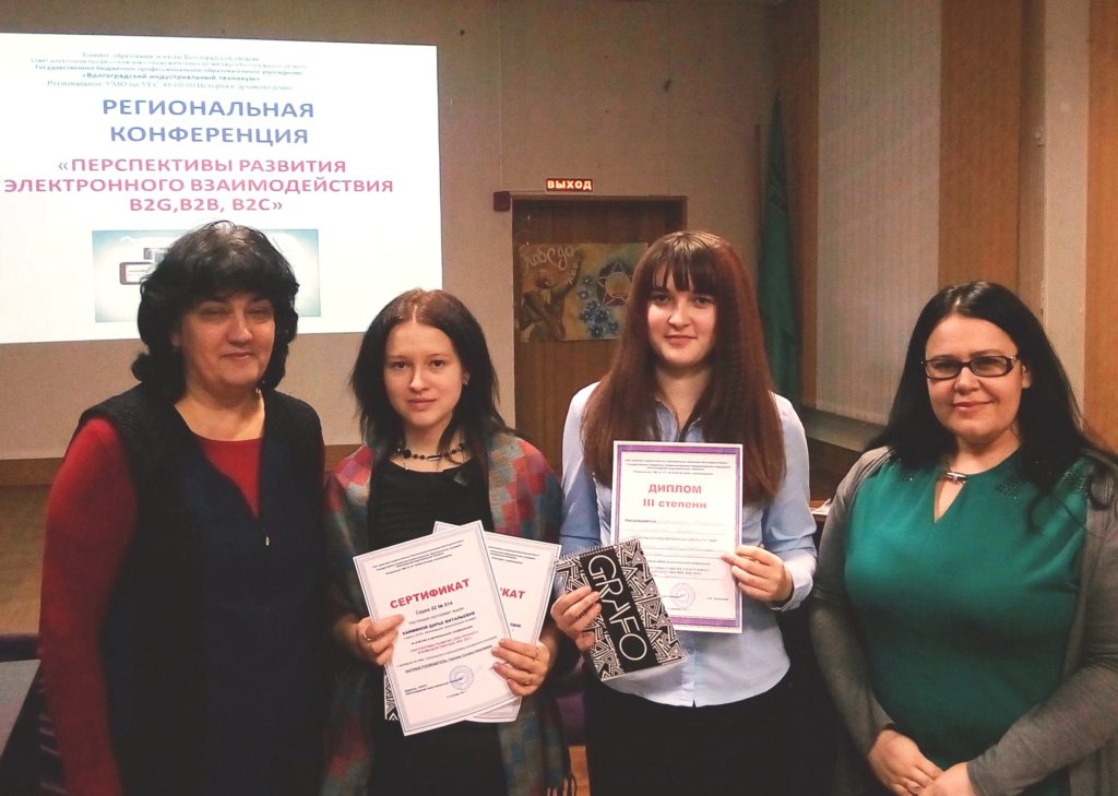 14 декабря 2017 года в ГБПОУ «Волгоградский индустриальный техникум» состоялась региональная конференция «ПЕРСПЕКТИВЫ РАЗВИТИЯ ЭЛЕКТРОННОГО ВЗАИМОДЕЙСТВИЯ B2G,B2B, B2C», в которой приняли участие 31 студент с 20 докладами. Среди участников студенты специальности «Документационное обеспечение управления и архивоведения» ГБПОУ «Волгоградский индустриальный техникум» и «ГБПОУ «Волгоградский технологический колледж».