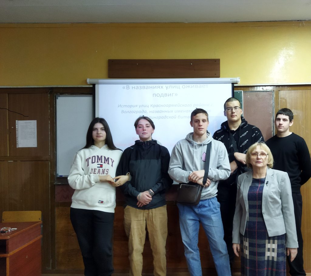 31 января 2024 года в рамках методической недели истории и в связи с 81-й годовщиной Победы в Сталинградской битве и приближающимся 80-летием Красноармейского района г. Волгограда в корпусе №3 ГБПОУ «Волгоградский индустриальный техникум» прошла конференция. Темой мероприятия стала история улиц Красноармейского района г. Волгограда, названных именами героев Сталинградской битвы: Н.Сердюкова, П.Ломакина, К.Панчишкиной, П. Романенко, В.Голубева, И. Малозёмова и др. Участники совершили заочное путешествие по карте Красноармейского района, начиная с проспекта Героев Сталинграда – главной магистрали нашего района – до улиц-новостроек.