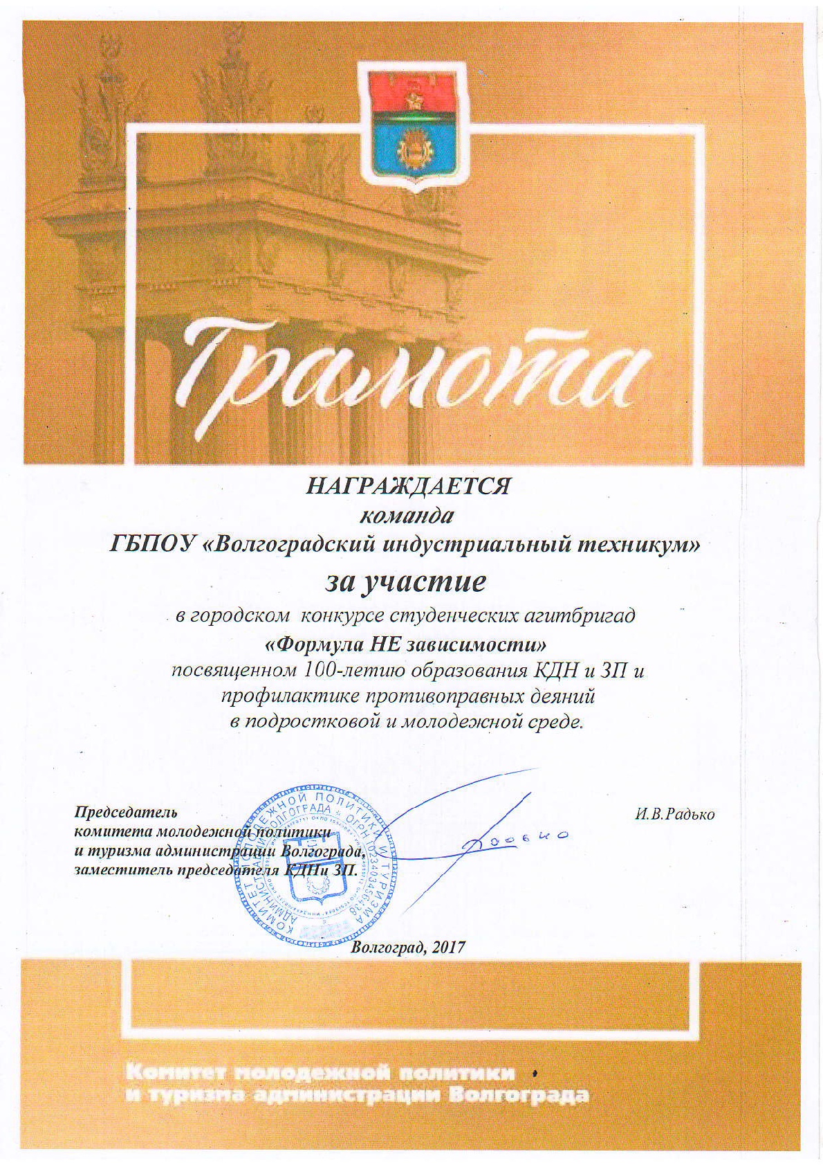 15 декабря 2017 г. на базе ГБПОУ «Волгоградский колледж управления и новых технологий» прошел городской конкурс студенческих агитбригад «Формула НЕ зависимости», посвященный 100-летию КДН и ЗП и профилактике противоправных деяний в подростковой среде.