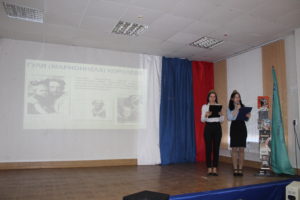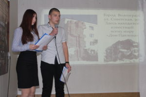 Во второй части мероприятия все группы первого курса стали участниками конкурса «Подвиг героев бессмертен». Студенты подготовили презентации о героях Сталинградской битвы: гр. ТМ-119- о Василии Зайцеве (куратор Молчанова Т.В); гр. ТМ-129-о ЯковеПавлове(куратор Афанасьев С.В.), С-119 – о Михаиле Паникахе (кураторЛукьянцева А.И.), С-129- о Василии Чуйкове (куратор Иванов В.Д.), гр.СЭЗиС-119 – о Матвее Путилове (кураторКоновалова Е.И.), АТ-о Рубене Ибаррури (куратор Романова Ю.В. ), гр.А– о малолетних партизанах «Босоногий гарнизон» (куратор Синельников С.П.), гр.Б-119- о Гуле Королёвой (кураторСарайкина С.В.), гр.Д-119- о Николае Сердюкове (куратор Нестерова А.Г.), гр.ВТВ-119- об Алексее Маресьеве (куратор Коваль Т.Б.).