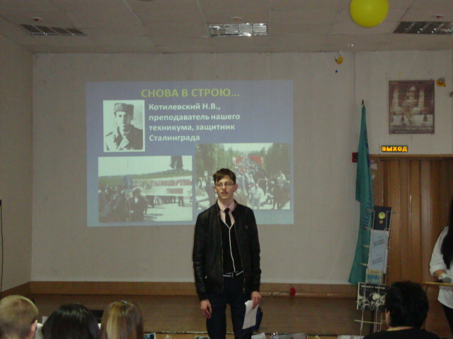 1 февраля 2019 года в актовом зале главного корпуса ГБПОУ ВИТ состоялся конкурс чтецов «Да не прервётся наша память!», посвящённый окончанию Сталинградской битвы. В конкурсе приняли участие обучающиеся первых курсов всех корпусов ГБПОУ ВИТ (36 человек).