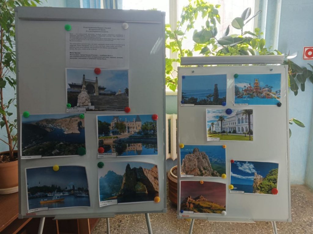 На выставках представлены фотографии достопримечательностей и значимых мест полуострова Крым. Выставки подготовили педагоги-библиотекари: Спиридонова Л.Н. и Гордиенко Т.Л.