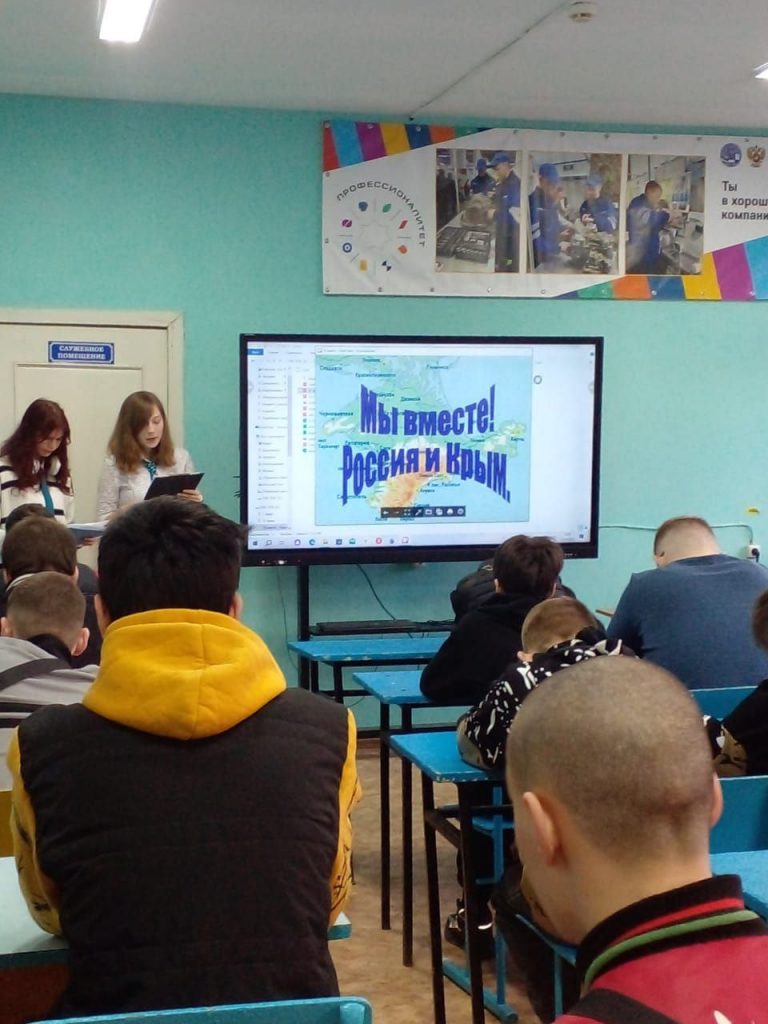 10 марта 2025 года на классном часе проведён тематический видеоурок: “Крым – это Россия! ” Воспитательная задача мероприятия: воспитание у студентов гордости и уважения к истории своей страны, государства в целом, её достижениям и достоянию, воспитание толерантности и дружеских отношений между братскими народами.