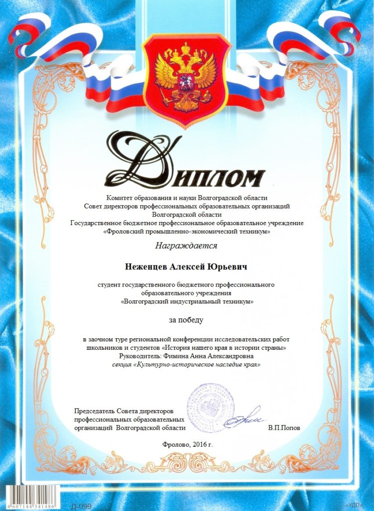 Неженцев Алексей, студент 1 курса специальности «Сварочное производство», принял участие в заочном туре региональной конференции исследовательских работ школьников и студентов «История нашего края в истории моей страны», которая проводилась в городе Фролово Волгоградской области в ноябре 2016 года. Его работа «История Красноармейского района в названиях улиц» в секции «Культурно – историческое наследие края» была отмечена дипломом.