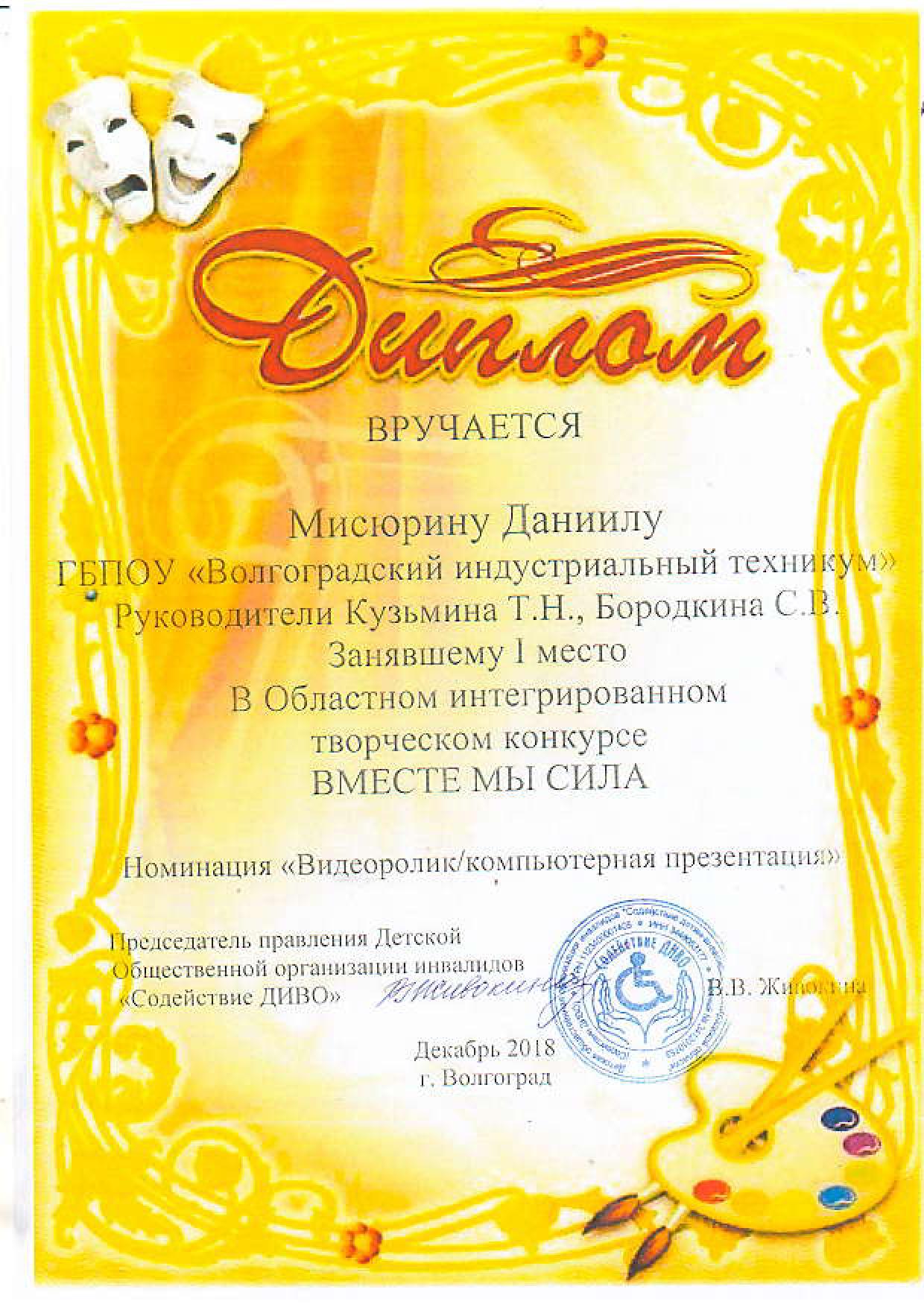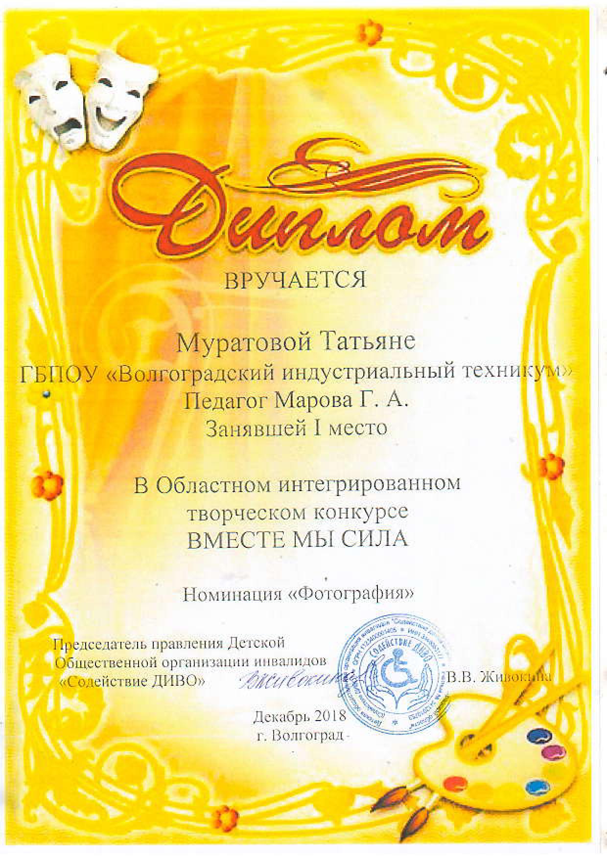 «Вместе мы – сила!» – это название областного интегрированного творческого конкурса объявленный Центром по работе с подростками и молодежью «Форум» для детей и подростков с ограниченными возможностями, целью которого является социализация и адаптация данной категории молодежи. Студенты нашего техникума приняли участие в данном конкурсе в двух номинациях: видеоролик – Мисюрин Даниил, гр. М-018а, занявший 1 место и фотография- Муратова Татьяна, гр.М-018а, занявшая 1 место.
