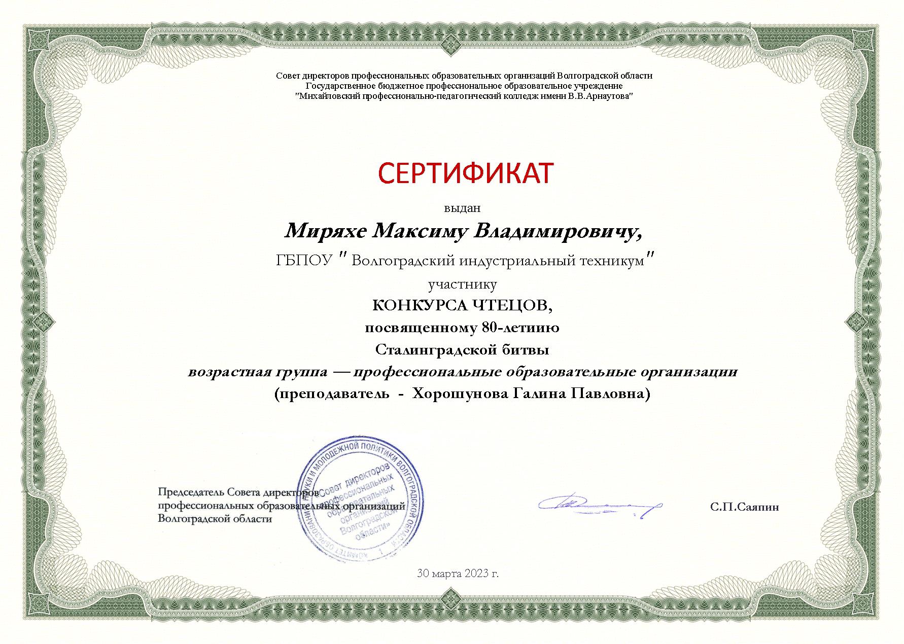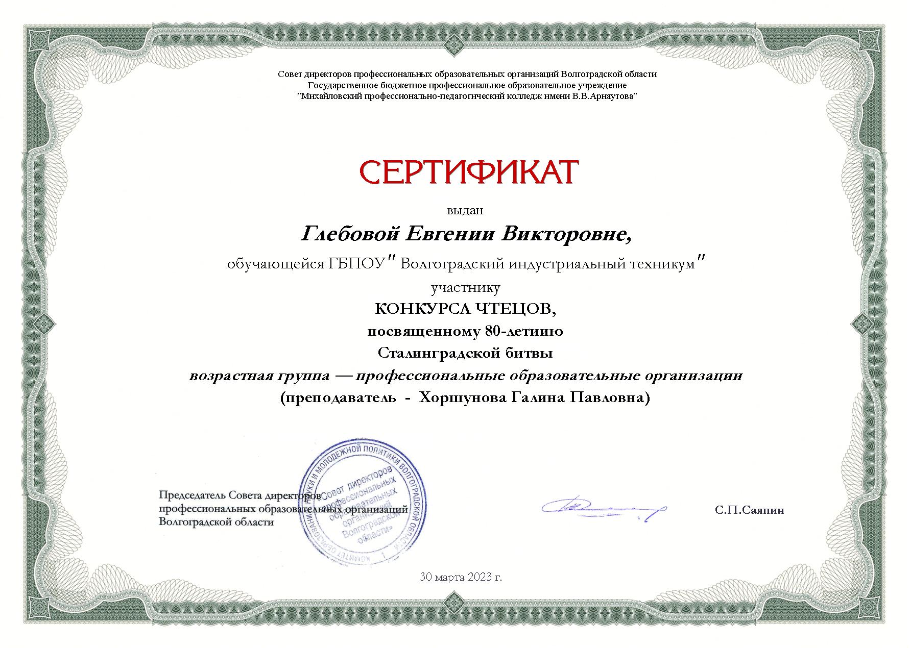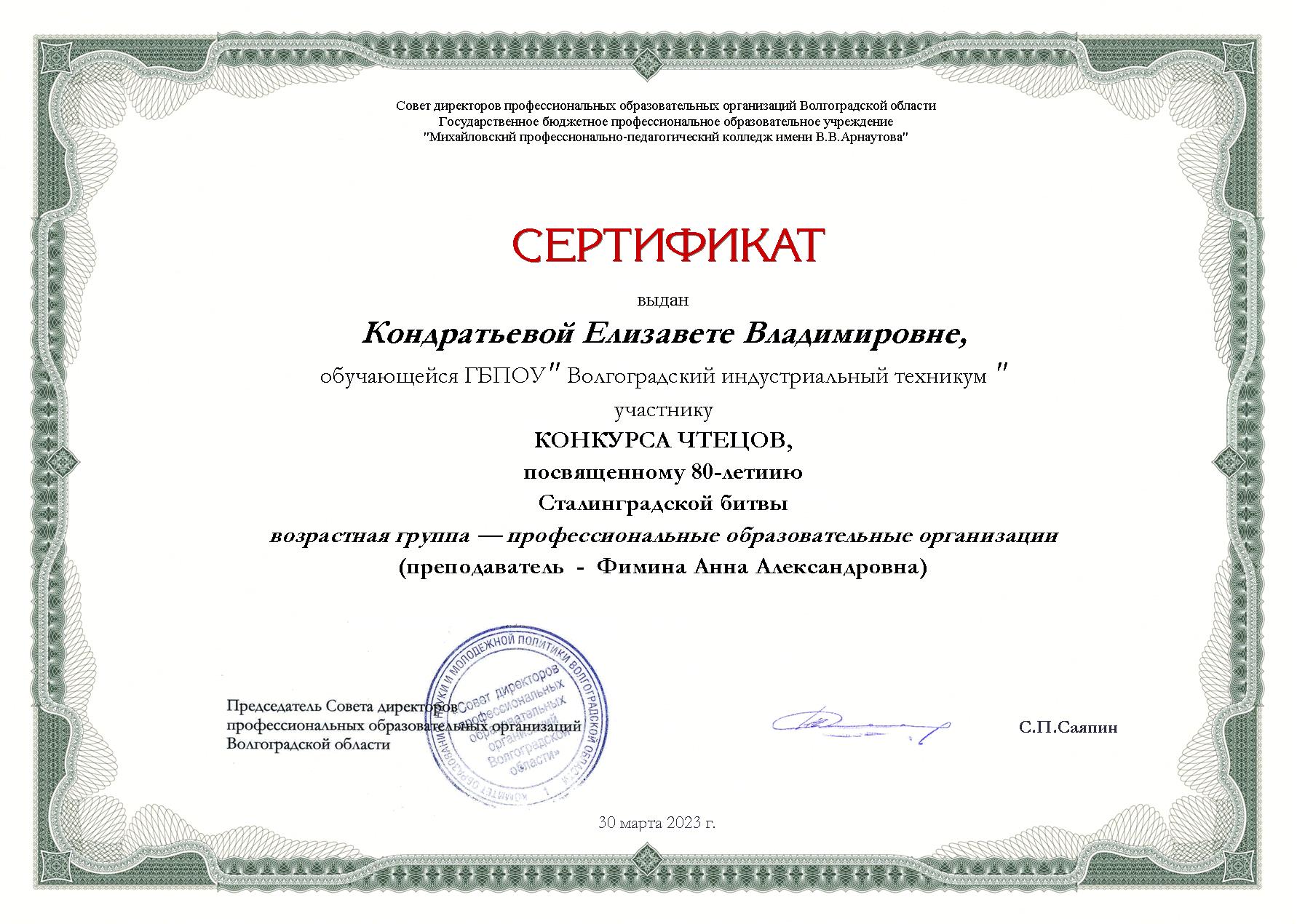 Обучающиеся первого курса ГБПОУ «Волгоградский индустриальный техникум» приняли самое активное участие в данном мероприятии (руководители – Хорошунова Г.П., Фимина А.А., преподаватели русского языка и литературы). Участники: Жерякова Анна, Зеленяк Степан (гр.ВТВ-112), Казанцев Егор (гр.ВТВ-122), Сладкова Алина, Кондратьева Елизавета (гр.Б-112), Чередниченко Анна, Миряха Максим, Глебова Евгения (гр.СЭЗиС) записали на видео стихи на военную тему разных авторов. Участие было дистанционным. Конкурсанты отмечены сертификатами.