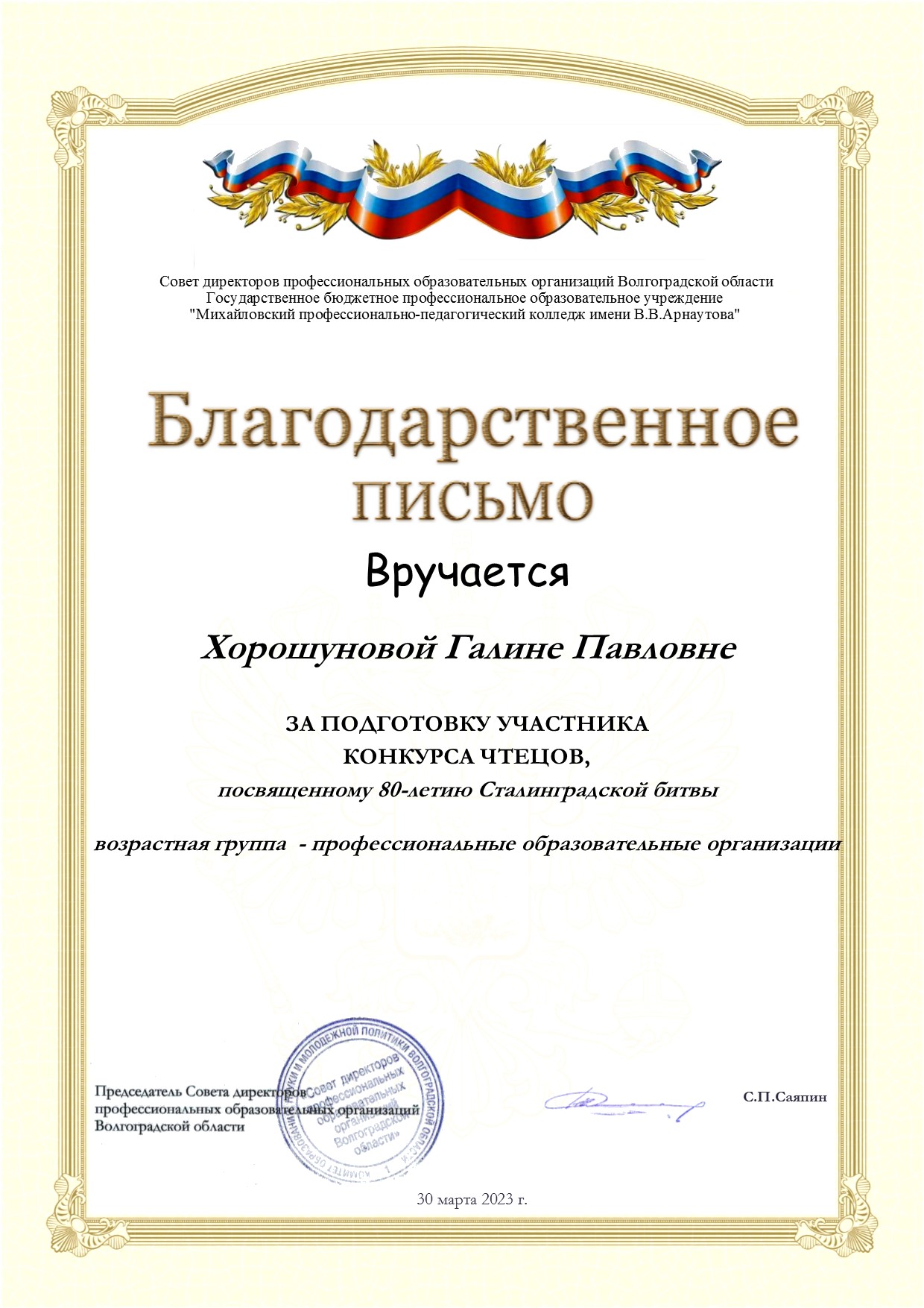 30 марта 2023 г. на базе ГБПОУ «МППК им. В.В.Арнаутова» состоялся региональный конкурс чтецов, посвященный 80-летию Сталинградской битвы. Конкурс был организован с целью патриотического воспитания обучающихся, создания условий для духовного обогащения молодого поколения и художественного самовыражения.