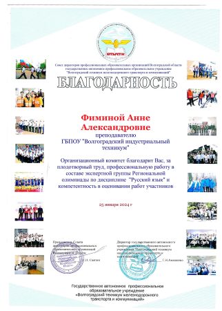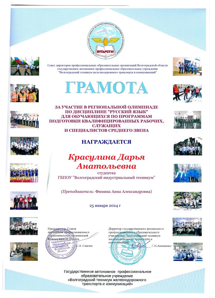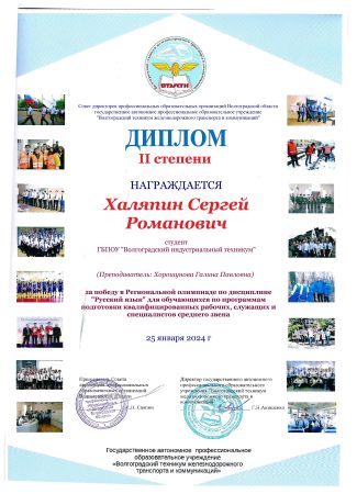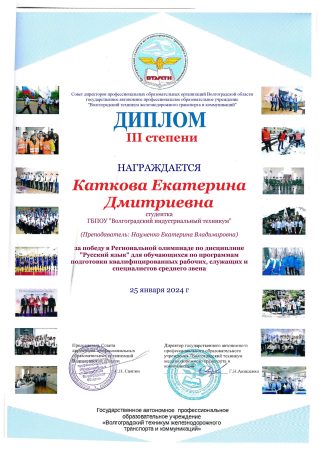 25 января года 2024 года состоялась региональная олимпиада по дисциплине «Русский язык» для обучающихся по программам подготовки квалифицированных рабочих, служащих и специалистов среднего звена на базе государственного автономного профессионального образовательного учреждения «Волгоградский техникум железнодорожного транспорта и коммуникаций».