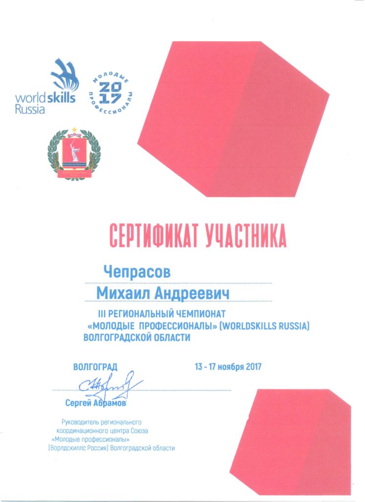 С 13 по 17 ноября 2017 года проводился III Региональный чемпионат «Молодые профессионалы» (WorldSkills Russia) Волгоградской области. Чемпионат проводился по 23 компетенциям. Соревновательный дух чемпионата позволяет максимально проявить таланты участников. А показанные высокие результаты становятся основой новых стандартов профессионального мастерства. В целом это позволяет сделать экономику нашей страны высокотехнологичной и современной.