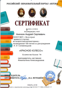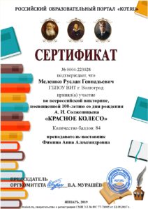 Отдельные обучающиеся первых курсов ГБПОУ ВИТ приняли участие во Всероссийской викторине «Красное колесо», посвящённой этой дате. (преподаватель Фимина А.А.). Участники были отмечены сертификатами.