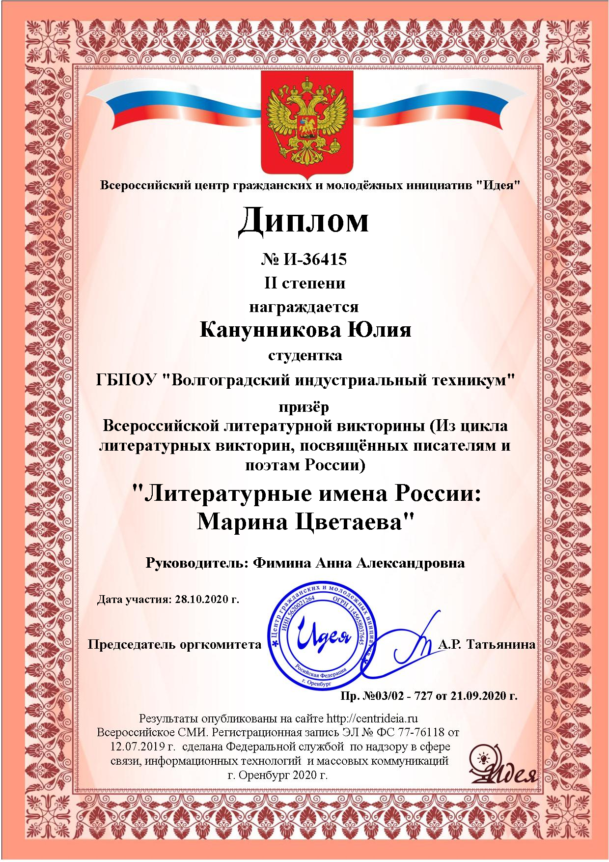 Обучающиеся первого курса ГБПОУ ВИТ Канунникова Юлия и Дежевой Илья стали призёрами литературной викторины, посвящённой жизни и творчеству Марины Цветаевой.