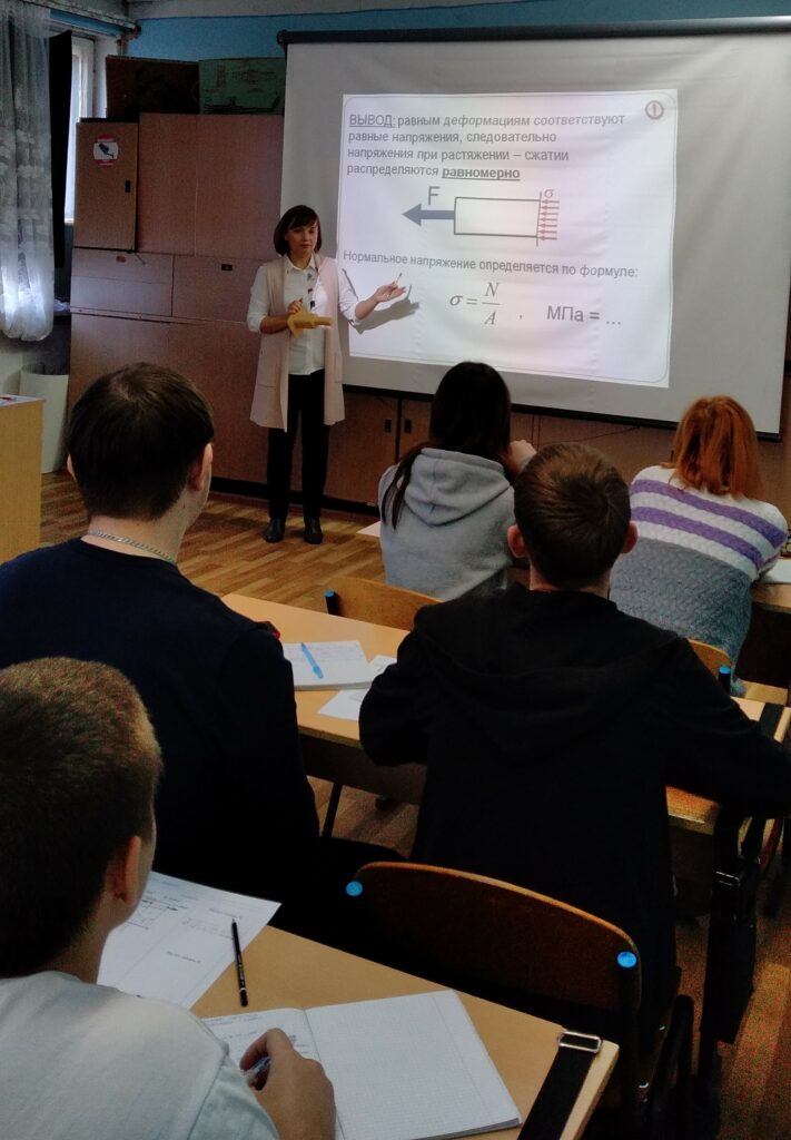 Открытый урок на тему: Растяжение и сжатие. Эпюры продольных сил и нормальных напряжений подготовила и провела преподаватель Клюева М.А. Тип занятия: комбинированный урок. Во время занятия преподаватель Клюева Мария Анатольевна формировала у учащихся знания и умения по построению эпюр продольных сил и нормальных напряжений. Методист техникума и присутствующие преподаватели оценили методы ведения занятия на высокую оценку.
