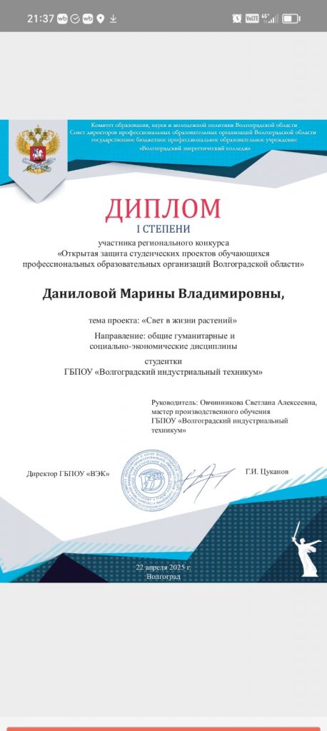 В номинации гуманитарного и социально-экономического направления от нашего техникума под руководством Овчинниковой С.А. выступила студентка 1 курса профессии Мастер растениеводства Данилова Марина, которая заняла почетное первое место. Тема индивидуального проекта «Роль света в жизни растений».