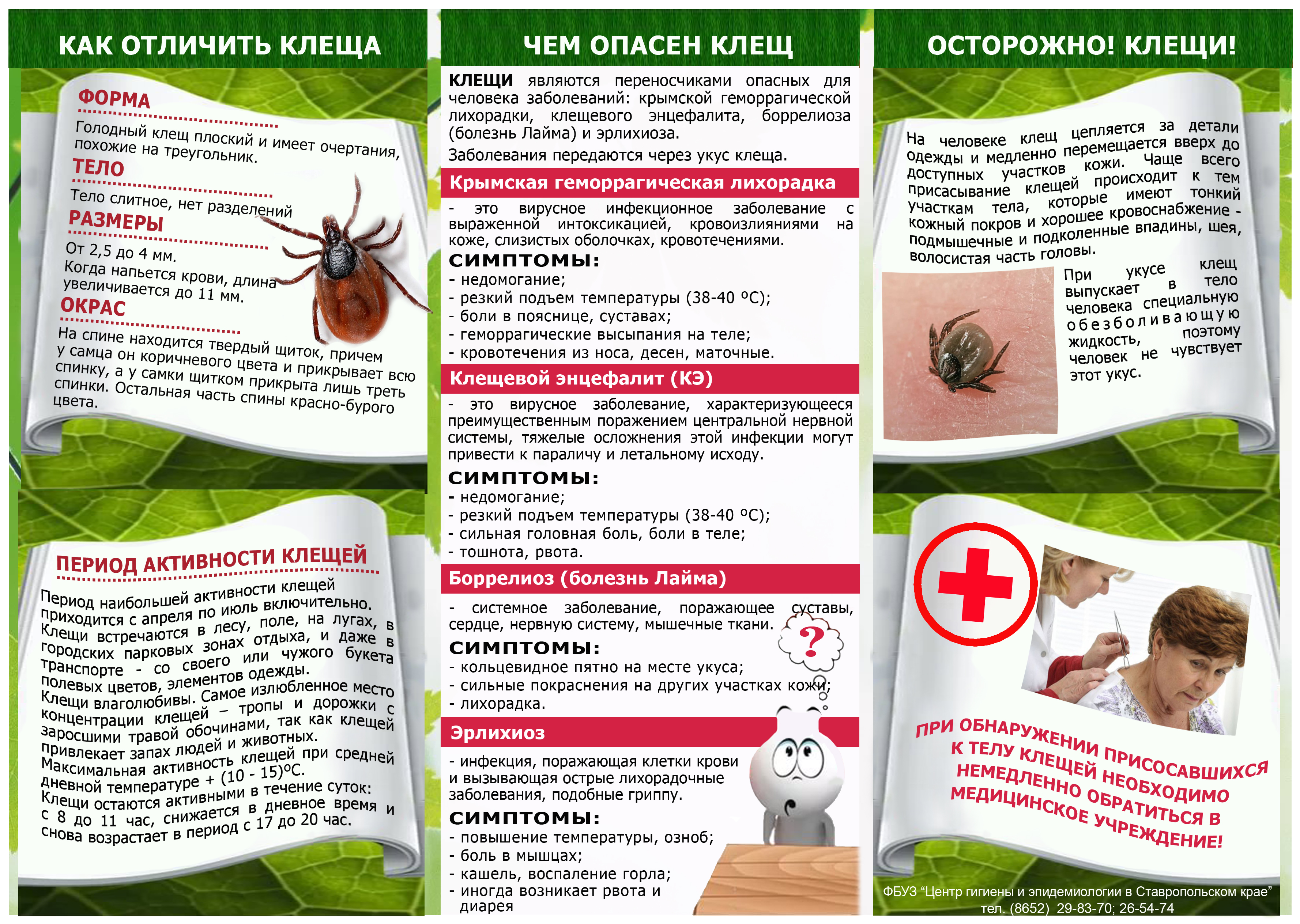 Что делать, если обнаружил присосавшегося клеща? ГЛАВНОЕ НЕ РАЗДАВИТЬ КЛЕЩА! Необходимо обратиться за медицинской помощью, врач назначит профилактическое лечение. Если возможности обратиться за медицинской помощью нет, то клеща нужно вытащить как можно скорее, но при этом необходимо соблюдать осторожность. Можно вытаскивать его пинцетом или ниткой, обвитой вокруг головы клеща, выкручивающими движениями. В течение 14 дней после присасывания клеща необходимо проводить термометрию два раза в день.
