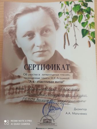 В поэтическом мероприятии от ГБПОУ ВИТ приняла участие Малиновская Каролина, гр. ИСиП-124 (преподаватель Фимина А.А.). Все выступления ребят были достойны внимания и самой высокой оценки. Победители были награждены дипломами и памятными призами, конкурсанты и педагоги получили сертификаты об участии в литературных чтениях, посвященных памяти поэтессы М.К. Агашиной «А я – счастливая жила!».