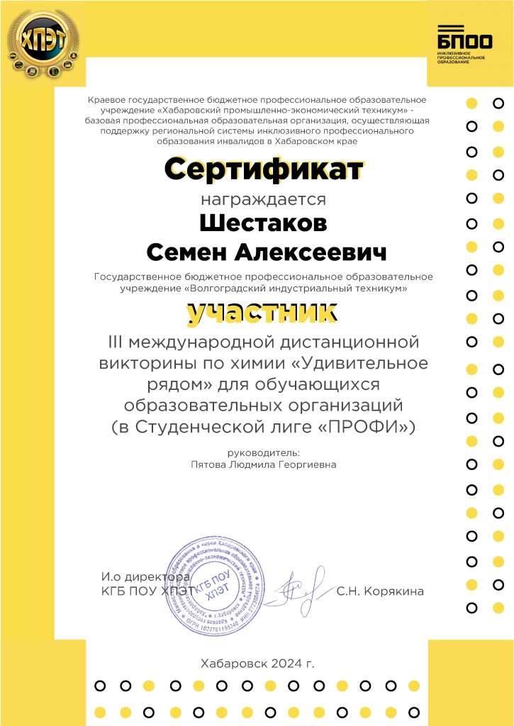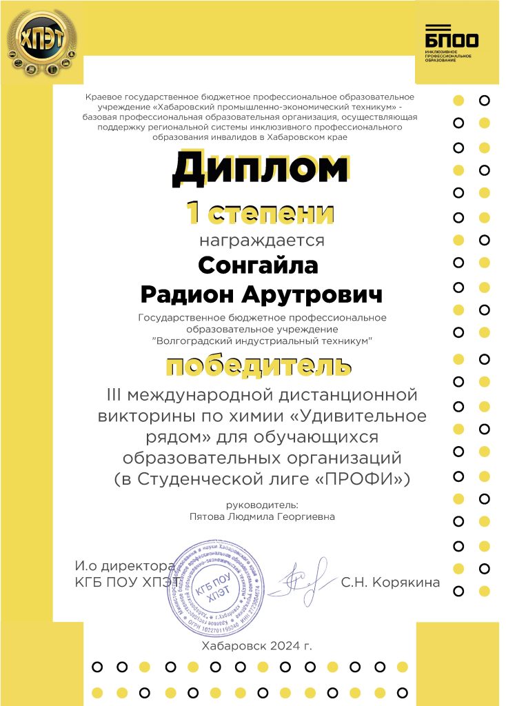 Студенты группы МТН-113кр Сонгайла Радион и Шестаков Семен приняли участие в III Международной дистанционной викторине по химии «Удивительное рядом» для обучающихся общеобразовательных, профессиональных образовательных и высших учебных учреждений  в студенческой лиге «ПРОФИ». Викторина проходила  с 01.02.24 по 04.02.24 на базе краевого государственного бюджетного профессионального образовательного учреждения  «Хабаровский промышленно-экономический техникум». Сонгайла Радион получи диплом победителя 1 степени, Шестаков Семен – сертификат участника.