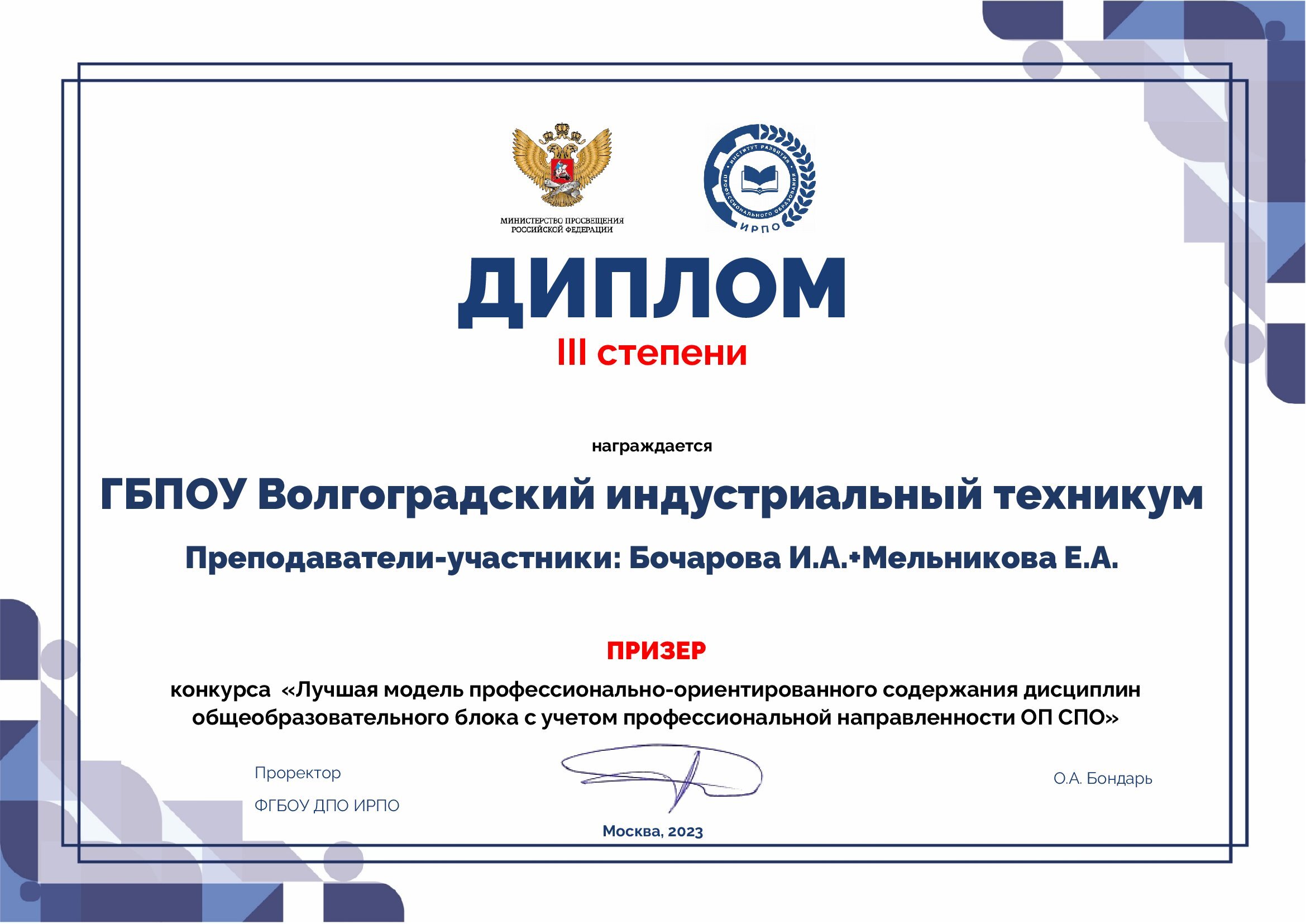 Из 25 ПОО участников конкурса Волгоградской области конкурсные материалы ГБПОУ ВИТ по образовательной программе по профессии 09.01.03 Оператор информационных систем и ресурсов заняли 3 место.