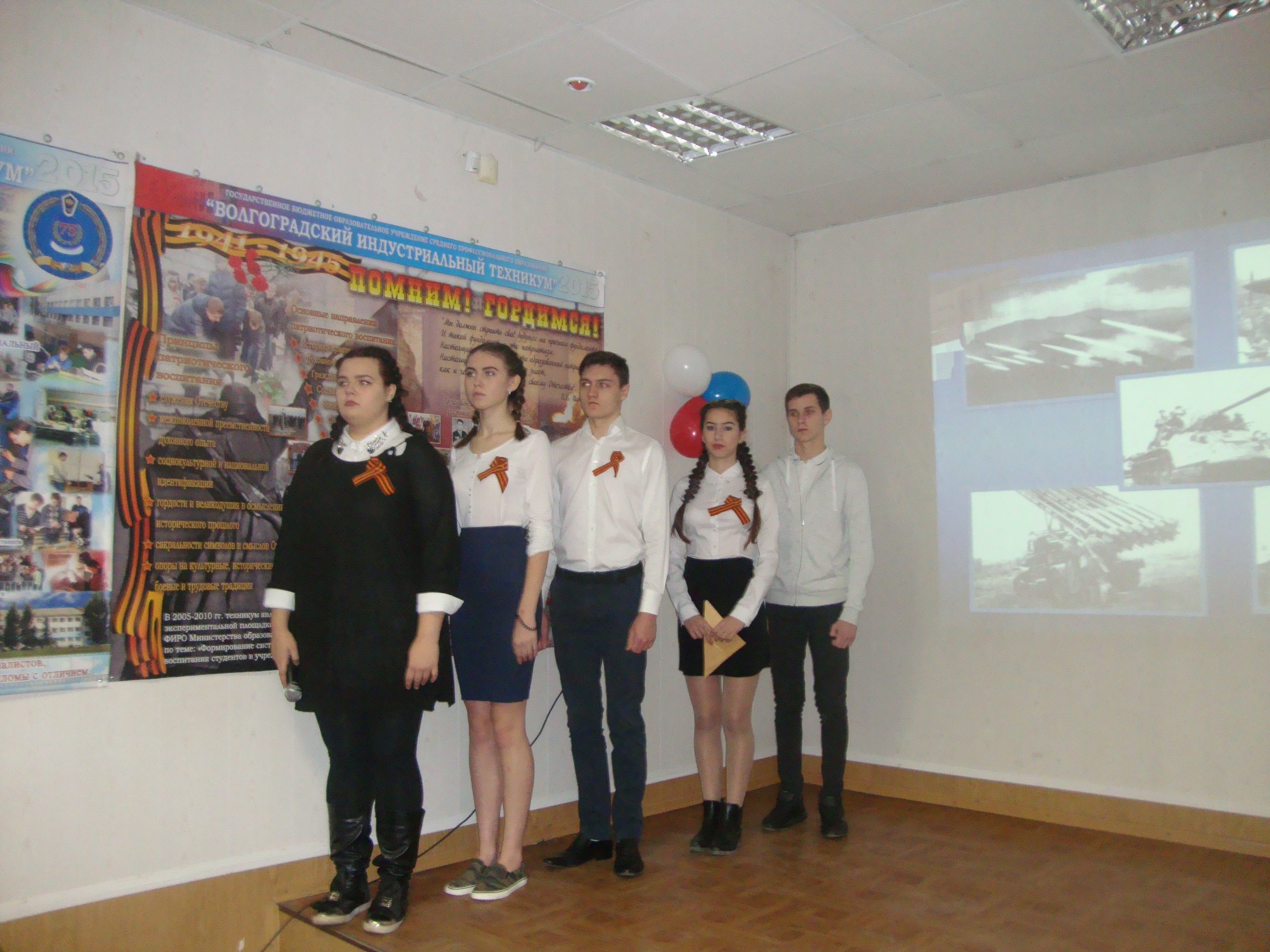 23 ноября 2017 года в ГБПОУ ВИТ в преддверии знаменательной даты – 75- летия Победы под Сталинградом состоялось торжественное мероприятие «Имена героев Великой Отечественной войны на карте Красноармейского района», целью которого было формирование у обучающихся активной гражданской позиции, патриотической сознательности, чувства долга и гордости за свой город, за подвиг советских людей в годы войны. Почётными гостями мероприятия были представители общественной организации «Защитники и жители блокадного Ленинграда», которую возглавляет Почётный житель города-героя Волгограда Хельви Николаевна Латту. Организация проводит большую патриотическую работу среди молодёжи.