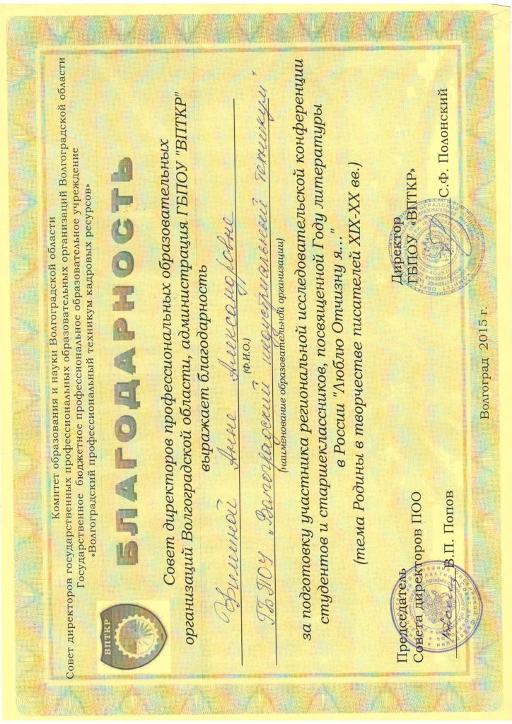 25 ноября 2015 года на базе ГБПОУ «ВПТКР» состоялась региональная исследовательская конференция студентов и старшеклассников, посвященная Году литературы в России «Люблю Отчизну я…» (тема Родины в творчестве писателей XIX-XX вв.).