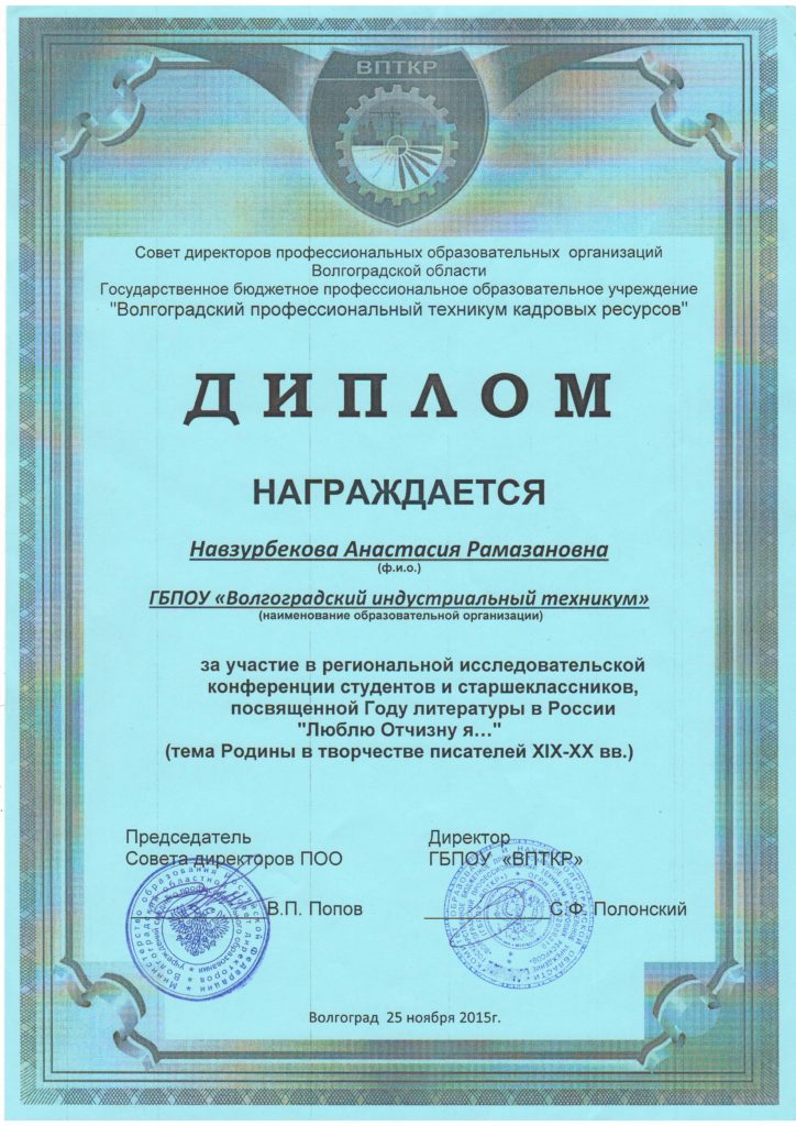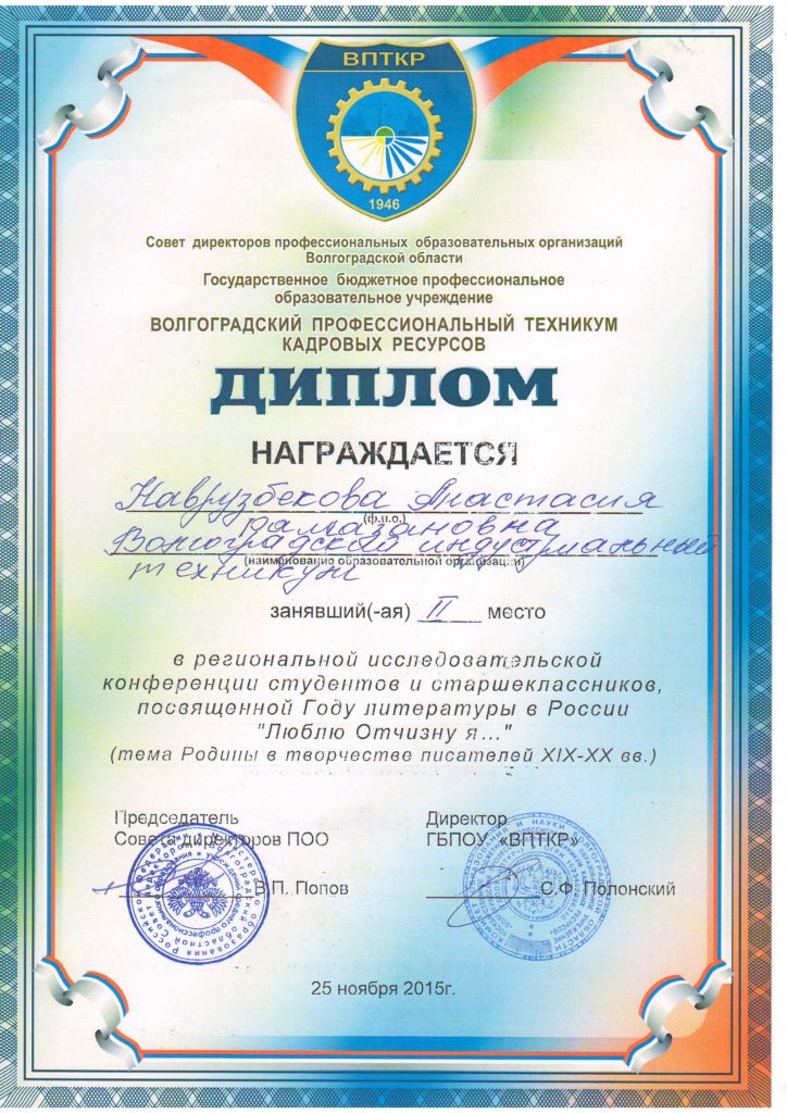 Наврузбекова Анастасия, студентка 3 курса специальности «Документационное обеспечение управления и архивоведение», достойно представила Волгоградский индустриальный техникум в секции 3 «Современный литературный процесс», заняв 2 призовое место.