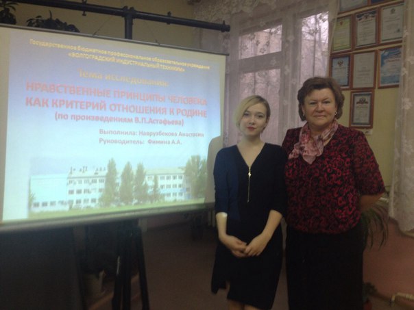 Тема её исследования: «Нравственные принципы человека как критерий отношения к Родине (по произведениям Виктора Астафьева)». Руководитель исследования – Фимина Анна Александровна, преподаватель русского языка и литературы.