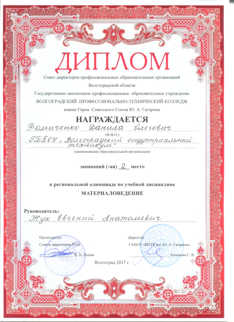 Награждается студент ТМ1-15 Фомиченко Данила Олегович занявший 2 место в региональной олимпиаде по дисциплине “Материаловедение”