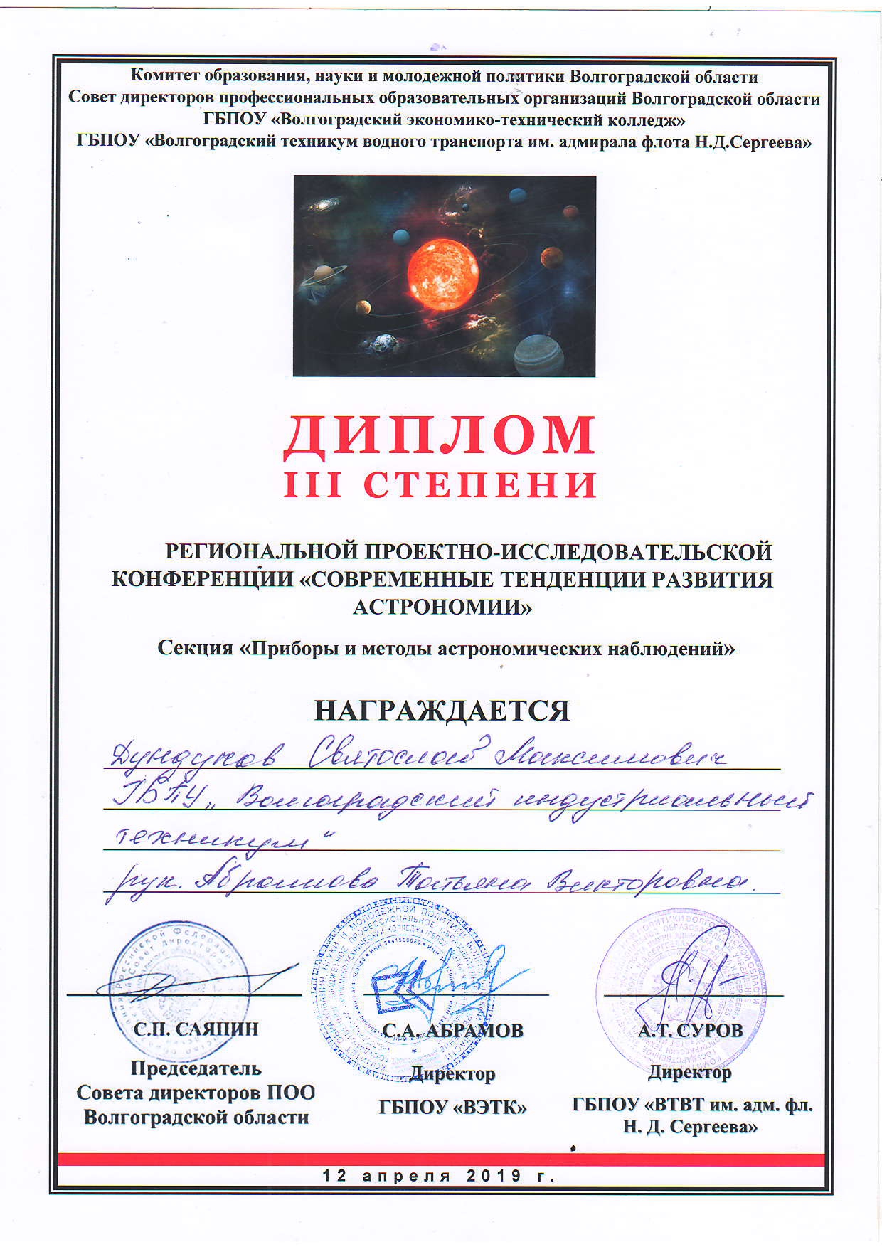 12 апреля 2019 года в ГБПОУ «Волгоградский техникум водного транспорта им. адмирала флота Н.Д.Сергеева» проводилась региональная проектно-исследовательская конференция «Современные тенденции развития Астрономии». В Конференции принимали участие студенты 1 курса профессиональных образовательных организаций г. Волгограда и Волгоградской области. Наш техникум представлял студент группы ВТ-118 Дундуков Святослав Максимович и занял почётное третье место в секции «Приборы и методы астрономических наблюдений». Святославом под руководством преподавателя Абрамовой Т.В. была выполнена работа на тему «Современные возможности человека в космосе».