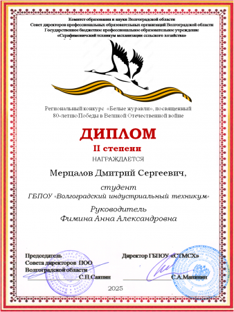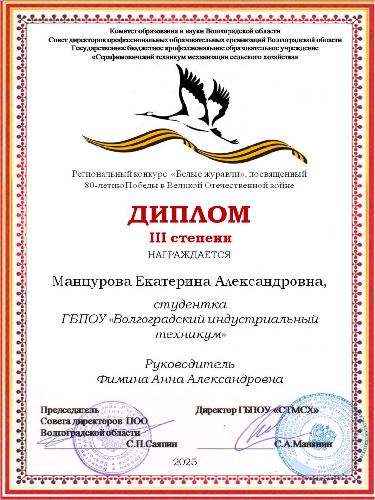 В феврале 2025 года на базе ГБПОУ «Серафимовичский техникум механизации сельского хозяйства» состоялся региональный конкурс «Белые журавли», посвящённый 80-летию Победы в Великой Отечественной войне.