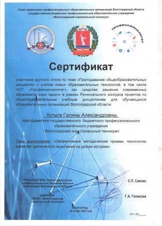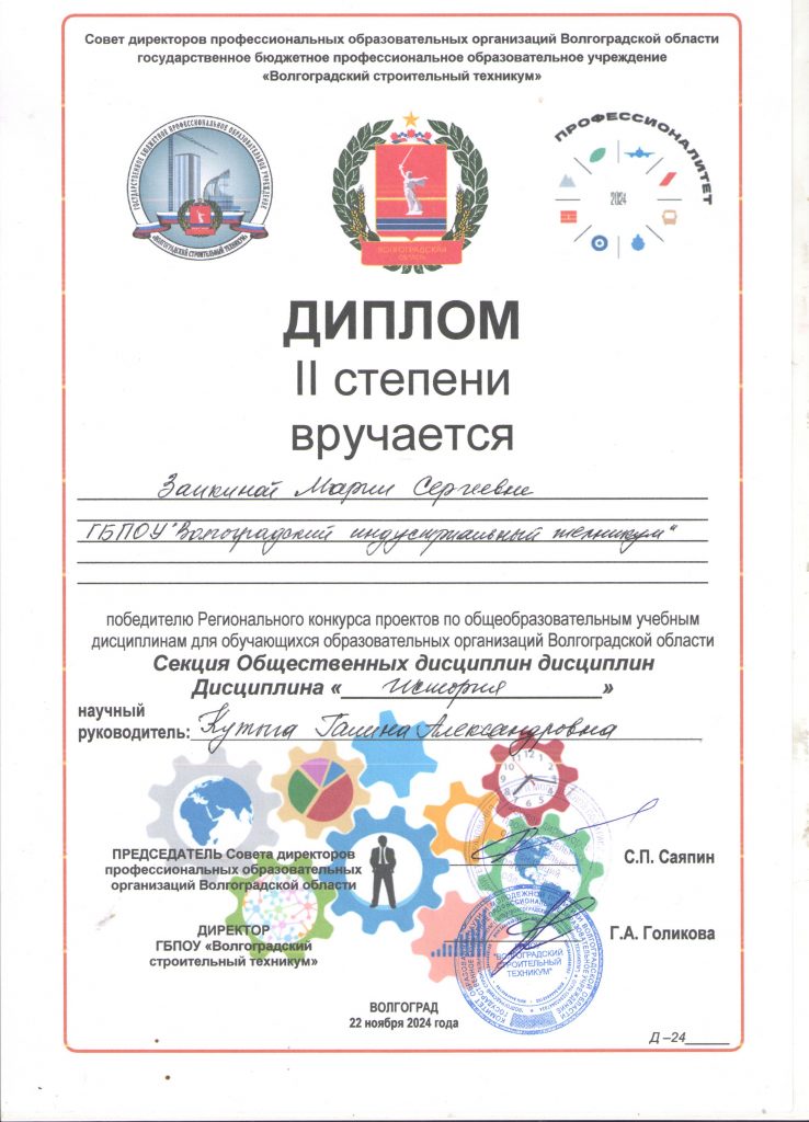 ГБПОУ «Волгоградский индустриальный техникум» представляла на конкурсе студентка 1 курса группы СЭЗиС-124 Заикина Мария, которая подготовила и представила исследовательский проект по истории на тему «Великий реформатор Столыпин» ( руководитель проекта – Кутыга Г.А.)