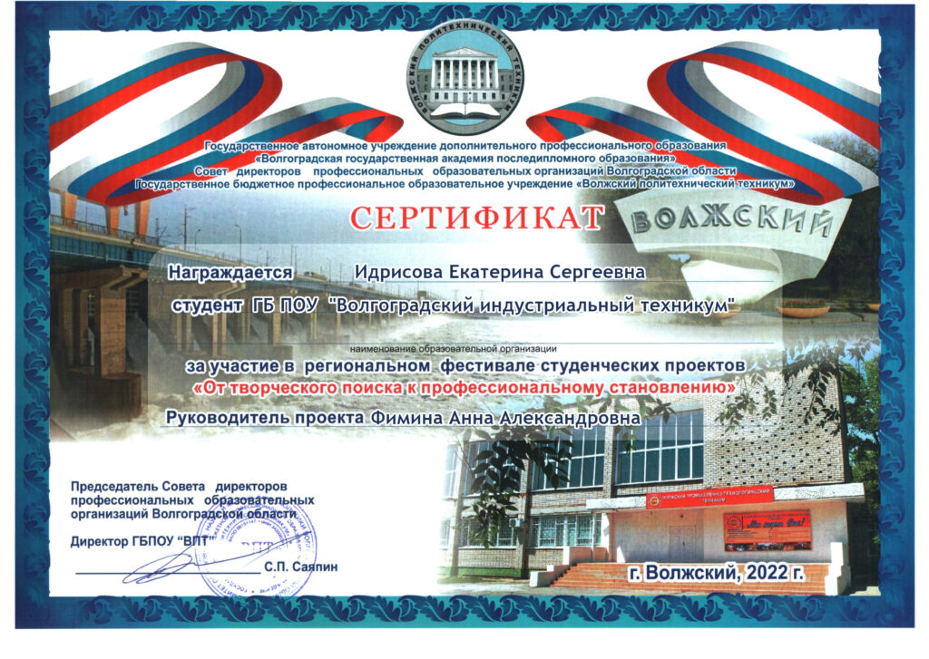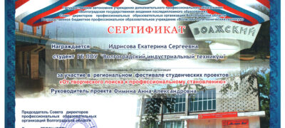 В фестивале, в номинации «Патриотизм и гражданское воспитание как национальная идея современной России: от теории к практике», приняла участие Идрисова Екатерина, обучающаяся первого курса ГБПОУ «Волгоградский индустриальный техникум», (руководитель Фимина А.А., преподаватель русского языка и литературы).