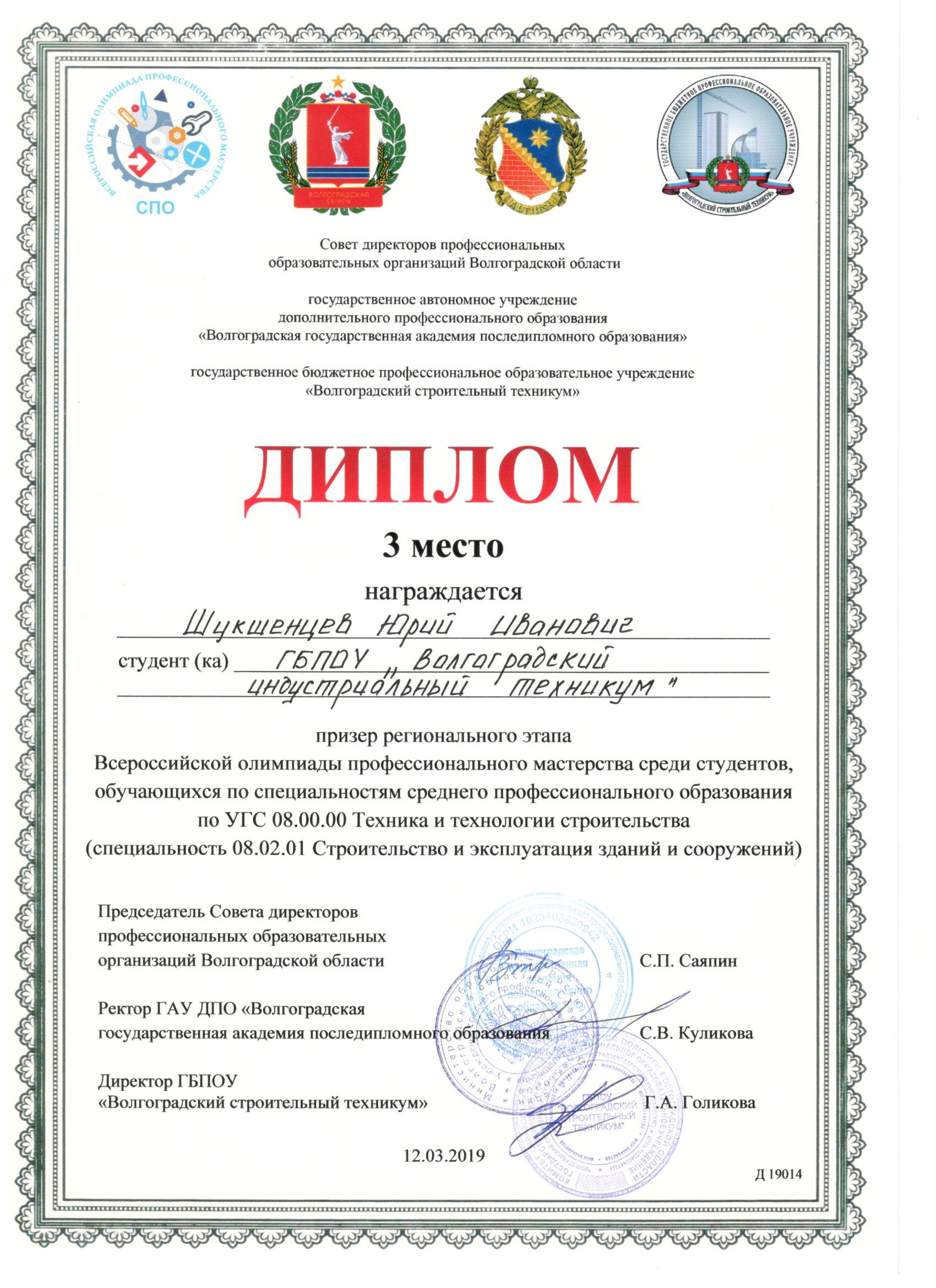 Шукшенцев Юрий Иванович стал призером Олимпиады и занял 3 место.