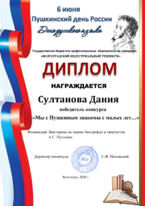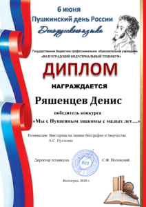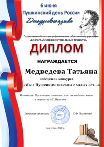 Дипломы победителей, призёров, участников можно будет скачать на сайте ГБПОУ ВИТ в разделе конкурс ««Мы с Пушкиным знакомы с малых лет…».
