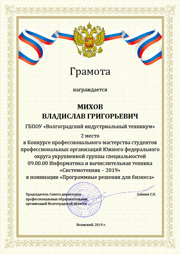 Михов Владислав Григорьевич занял 2 место в номинации «Программные решения для бизнеса»;