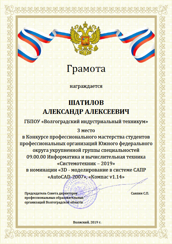 Шатилов Александр Алексеевич занял 3 место в номинации «3D – моделирование» в системе САПР «Компас»;