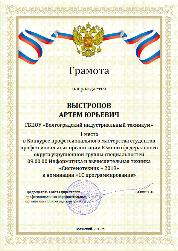 Выстропов Артем Юрьевич занял 1 место в номинации «1С программирование»;