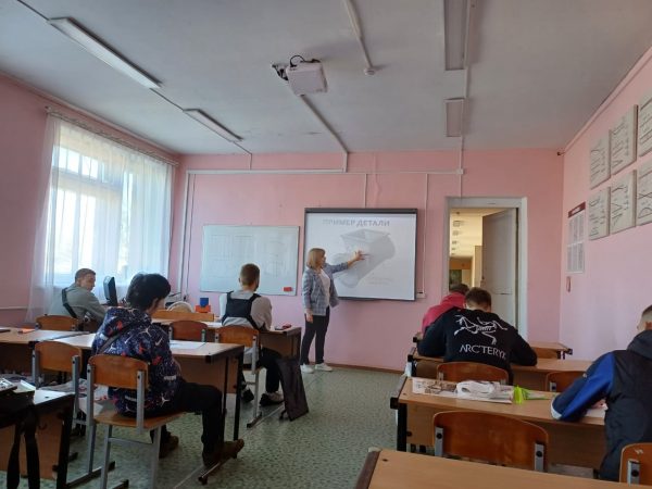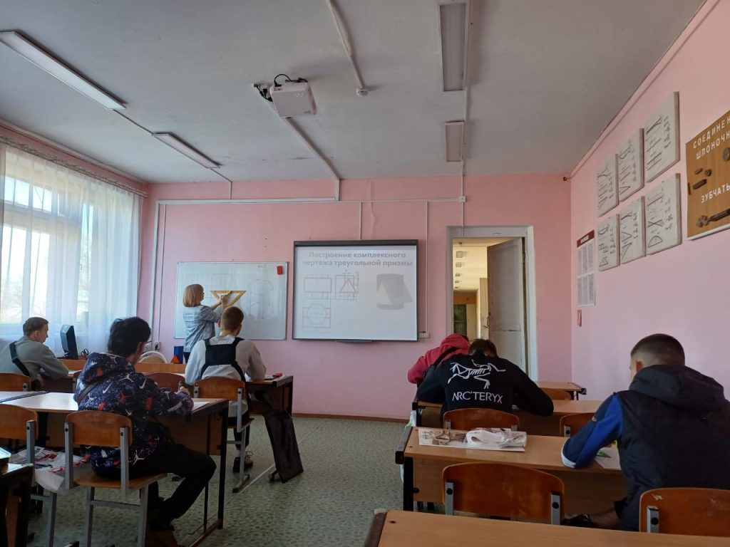 24 марта преподаватель Клюева М.А. провела в группе АТ-113п открытый урок по УД Инженерная графика. Тема: Комплексный чертёж и аксонометрия пересекающихся многогранников. Студенты второго курса выполнили чертёж пересекающихся призм.