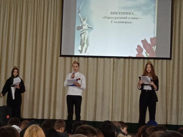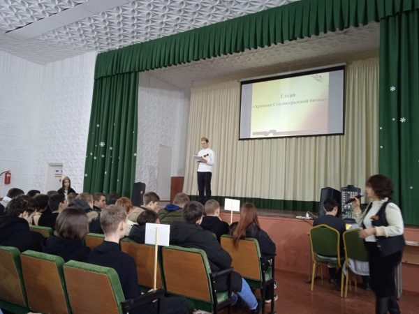 В мероприятии приняли участие обучающиеся 1 курса, группы: С-114, С-124, ПКД -114, ТМ -114 и преподаватель истории Василитченкова А. Н. Студенты приняли активное участие в трёх этапах видеовикторины: 1.Хроника Сталинградской битвы, 2.”Узнай героя”, 3.Памятники Сталинградской битвы”. Цель данного мероприятия – это формирование сознания необходимости защищать своё Отечество, развитие высокой социальной активности, гражданской ответственности, духовности, воспитание патриотизма, гордости и уважения за свой родной город и Россию.