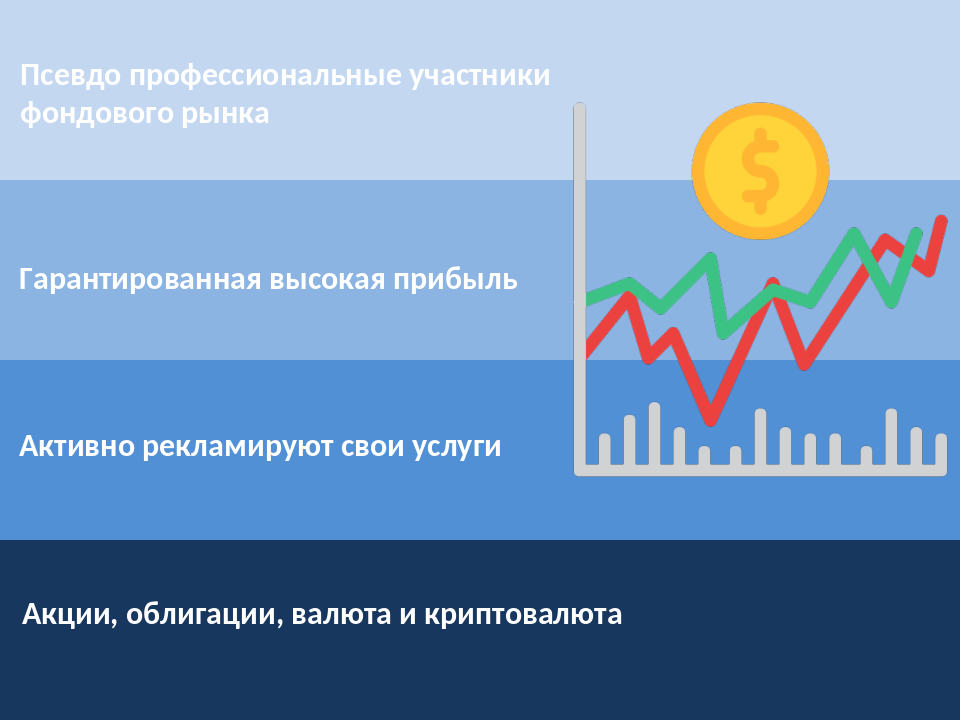 - Биржевое мошенничество. Данная противоправная схема используется для обмана неопытных пользователей, недавно решивших познать законы биржевого рынка и заработать легкие деньги. Роль мошенников выполняют работники трейдовой организации «однодневки». Различными доступными способами они набирают клиентов для обучения игре на биржевом рынке с гарантированной прибылью. Акцентируют внимание на короткое и легкое обучение с заработком с первого вложения, торгуя на фондовом рынке акциями, облигациями, валютами и криптоволютами. Другими словами, это псевдопрофессиональные участники финансового рынка, которые активно рекламируют свои услуги по организации торговли на фондовом рынке. Все риски для потерпевшего кроются в мелком шрифте в договоре, заключаемом между сторонами. Это длящийся вид мошенничества, на первых этапах потерпевший весьма воодушевлен рассказами о скорейшем обогащении, выполняет все указания работодателя. После прохождения обучения жертве предлагается попробовать выйти на биржевой рынок, вложить небольшую сумму денег, и продемонстрировать умения, полученные в ходе обучения. Однако, потерпевший не знает, что все действия на биржевом рынке он производит на запрограммированной бот-версии, которая при любых ситуациях и условиях алгоритмами выведет прибыль. Воодушевляясь своими успехами, потерпевший соглашается вносить на биржу все большие суммы. Не редко встречаются случаи, когда жертва берет кредиты под залог имущества, а в последствие его лишается, так как все денежные средства, внесенные на биржу, переводятся мошенниками в офшоры или иные подконтрольные им счета. Отличительной чертой такой трейдерской компанией является ее постоянный переезд в различные города. Отработав в одном регионе достаточное количество жертв, организация в один день переезжает в другой регион. Привлечение к уголовной ответственности работников таких организаций практически невозможно, ведь все риски потерпевший берет на себя, заключая договор.