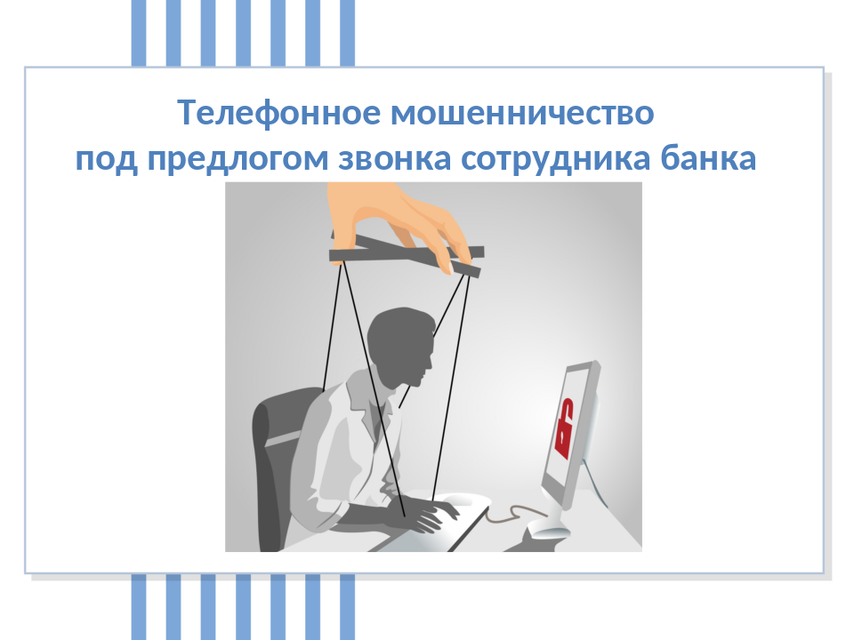 - Телефонное мошенничество под предлогом звонка сотрудника банка. Потерпевшему поступает звонок, где собеседник представляется сотрудником безопасности Банка, сообщает информацию о том, что якобы с банковской карты потерпевшего фиксировались попытки кражи денежных средств злоумышленниками, или же сообщает выдуманную операцию перевода денежных средств с банковской карты и называет вымышленные данные человека, в чей адрес якобы осуществлялся перевод. С целью предотвращения вымышленного перевода, потерпевшего вводят в заблуждение и ведут переговоры. В ходе разговора предупреждают о конфиденциальности и об уголовной ответственности за разглашение информации, полученной в процессе диалога с вымышленным сотрудником. Для введения в заблуждение и придания правдоподобности, мошенники могут высылать поддельные фотографии документов с удостоверениями, доверенностями и т.д., в подтверждение, что они действительно являются сотрудниками, например Центрального банка Российской Федерации. Цель мошенников – вывести денежные средства на «безопасные счета», открытые якобы в ЦБ РФ. В действительности же, денежные средства поступают на счета, подконтрольные мошенникам.