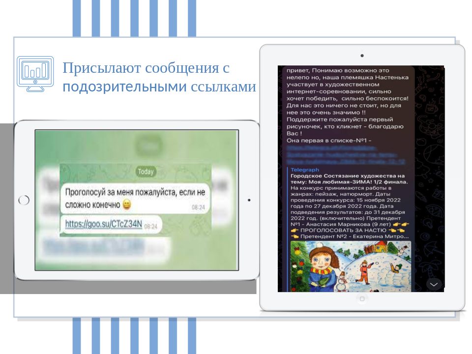 - Мошенничество с использованием социальных сетей, мессенджеров. Зачастую, на личные страницы пользователей или в мессенджере по личному абонентскому номеру приходят сообщения от знакомых или родственников, с просьбой занять денежные средства под различными предлогами, или же с просьбой проголосовать в конкурсе за ребенка, с прикреплением фишинговой ссылки для голосования. Полагая, что потерпевший ведет диалог со своим знакомым или родственником, он выполняет все поступающие указания. В конечном итоге мошенники заполучают денежные средства, которые потерпевший сам же переводит на подконтрольные счета мошенникам. Актуальной схемой мошенничества на сегодняшний день является ввод в заблуждение сотрудников администраций и комитетов области. Данная схема выглядит следующим образом. В мессенджере «Telegram» потерпевшему поступает сообщение якобы от руководителя государственного учреждения, в действительности фейкового аккаунта от его имени. Вступая в диалог, потерпевший подтверждает перед мошенниками свою заинтересованность, сотрудничество и готовность выполнить все указания. После чего, потерпевшему в мессенджере «Telegram» поступает звонок от мошенника, который представляется сотрудником ФСБ или вышестоящего государственного органа, и сообщает о необходимости принять участие в оперативно-розыскных мероприятиях по изобличению мошенников в банковской сфере, которые пытались оформить кредит на сотрудника. В свою очередь, потерпевший предупреждается о неразглашении данной информации и далее, по указанию участников преступной схемы, с целью сохранения своих денежных средств, его отправляют в различные банки, где последний должен получить кредиты и перевести деньги на «безопасные счета», которые в действительности принадлежат мошенникам. Для придания правдоподобности мошеннических действий, злоумышленники могут направлять сотрудникам различные уведомления от имени Центрального банка, а также изображения служебных удостоверений.