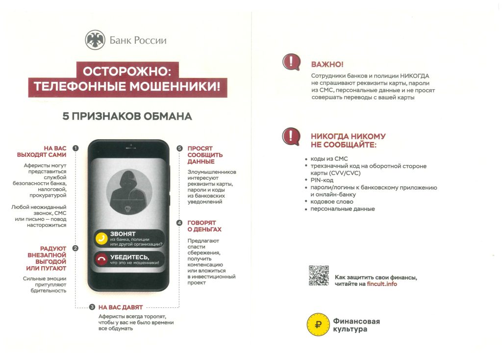 Важно: ни под каким предлогом не называйте неизвестным коды и пароли, пришедшие в смс-сообщениях, даже если звонившие представляются сотрудниками банков, операторов мобильной связи и т.д. Этой информацией могут воспользоваться злоумышленники.