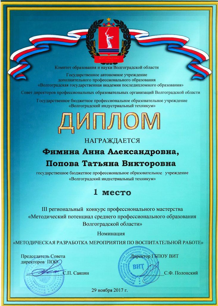 Бородич Е. А.,  Попова М. А. – ГБПОУ «Волгоградский профессиональный техникум кадровых ресурсов»