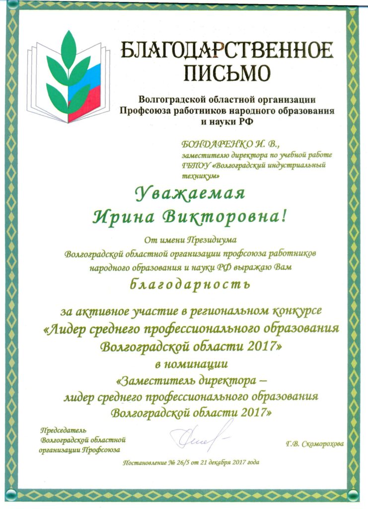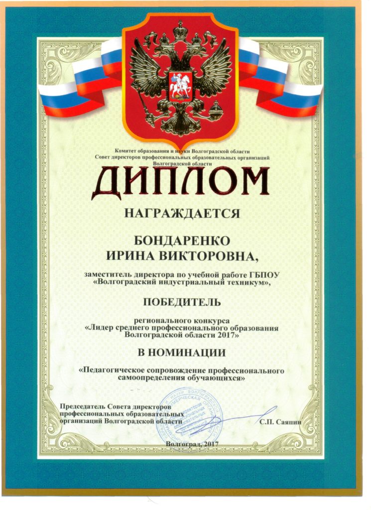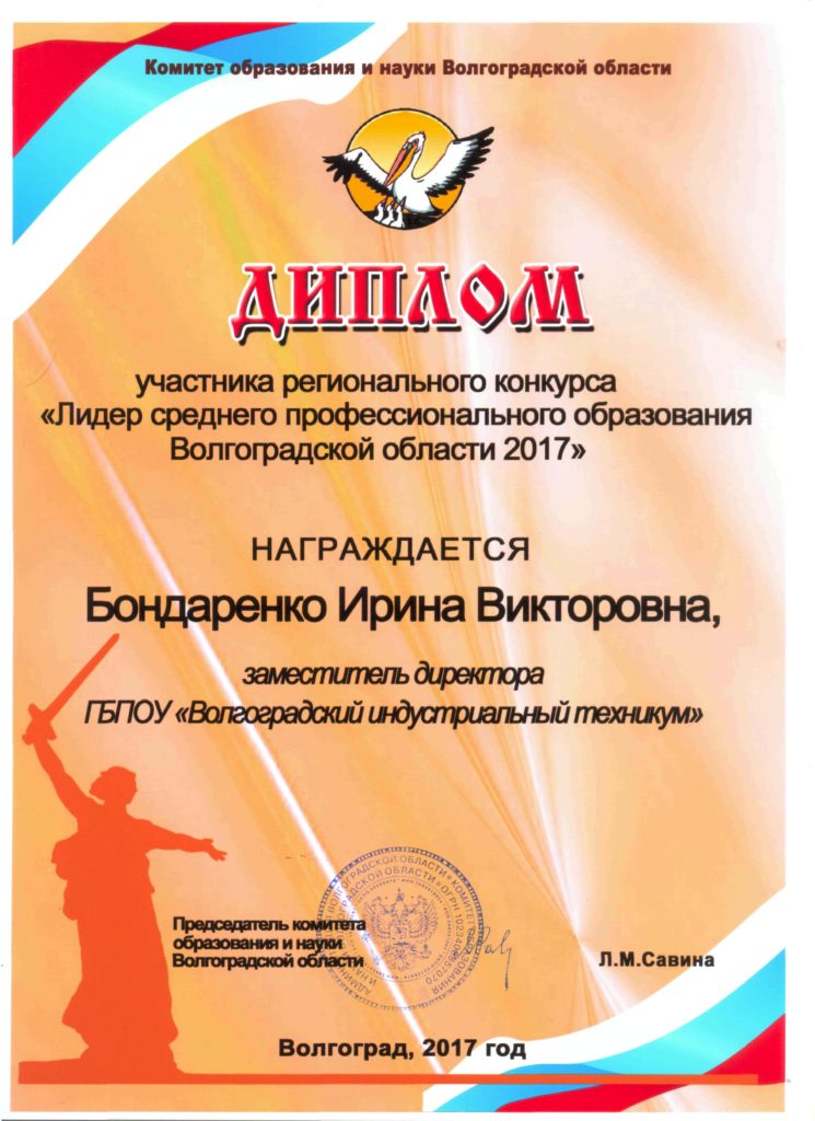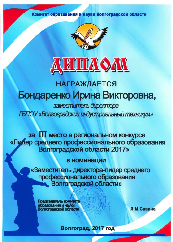 Волгоградский индустриальный техникум на конкурсе представляла заместитель директора по учебной работе Бондаренко Ирина Викторовна в номинации «Заместитель директора – лидер среднего профессионального образования Волгоградской области 2017». В данной номинации участвовали шесть представителей профессиональных образовательных организаций Волгоградской области. В региональном конкурсе Ирина Викторовна заняла 3 место с проектом «Педагогическое сопровождение профессионального самоопределения обучающихся».
