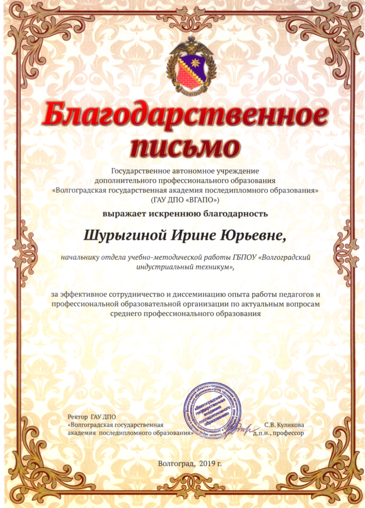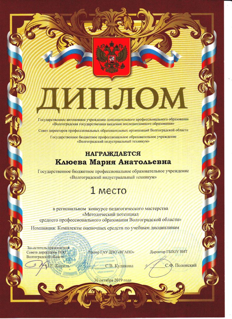 Кафедра теории и методики среднего профессионального образования ГАУ ДПО «Волгоградская государственная академия последипломного образования» совместно с Советом директоров профессиональных образовательных организации Волгоградской области и государственным бюджетным профессиональным образовательным учреждением «Волгоградский индустриальный техникум» с 23 сентября по 30 октября 2019 года провели 1 сессию V регионального конкурса педагогического мастерства «Методический потенциал среднего профессионального образования Волгоградской области» по номинации: Комплекты контрольно-оценочных средств по учебной дисциплине.